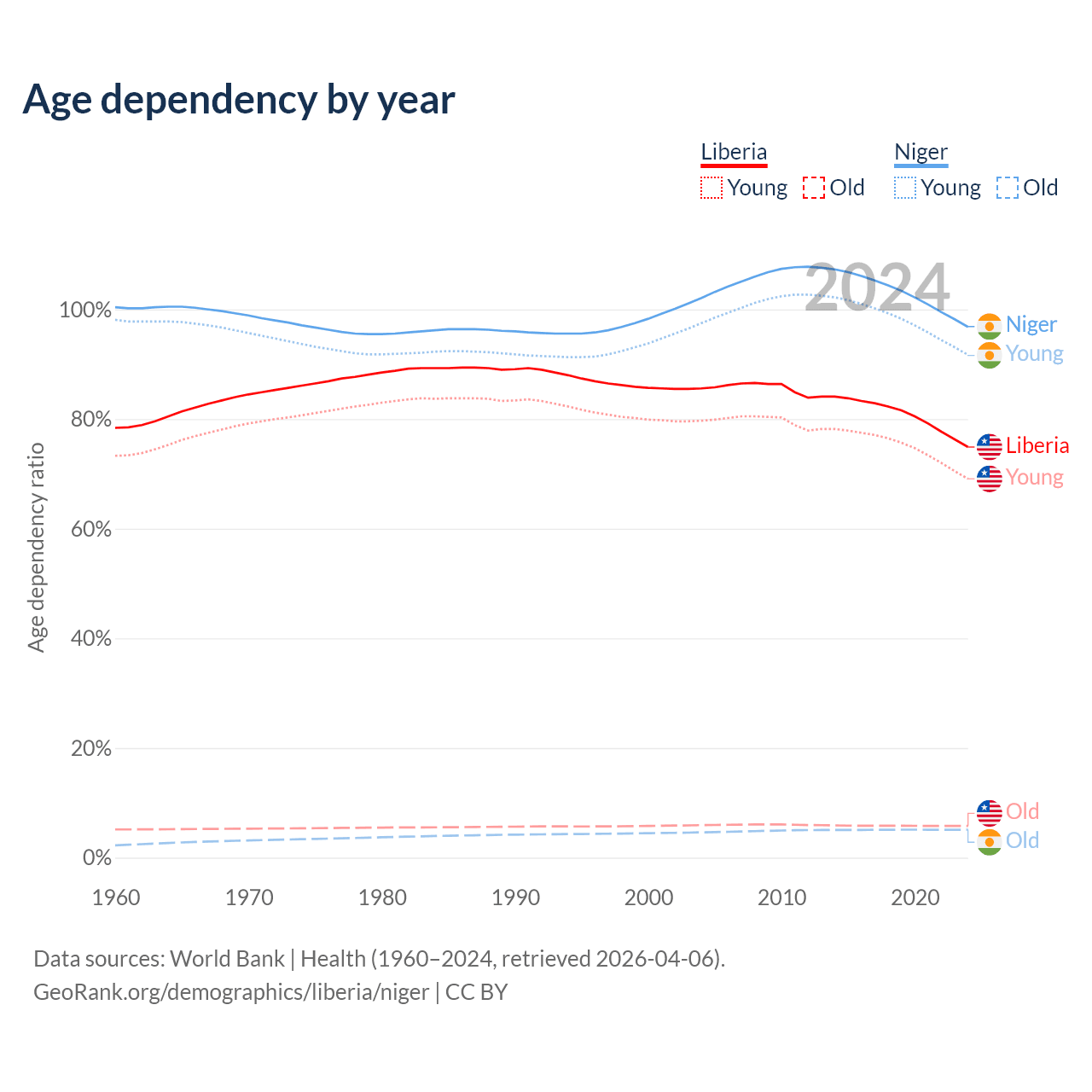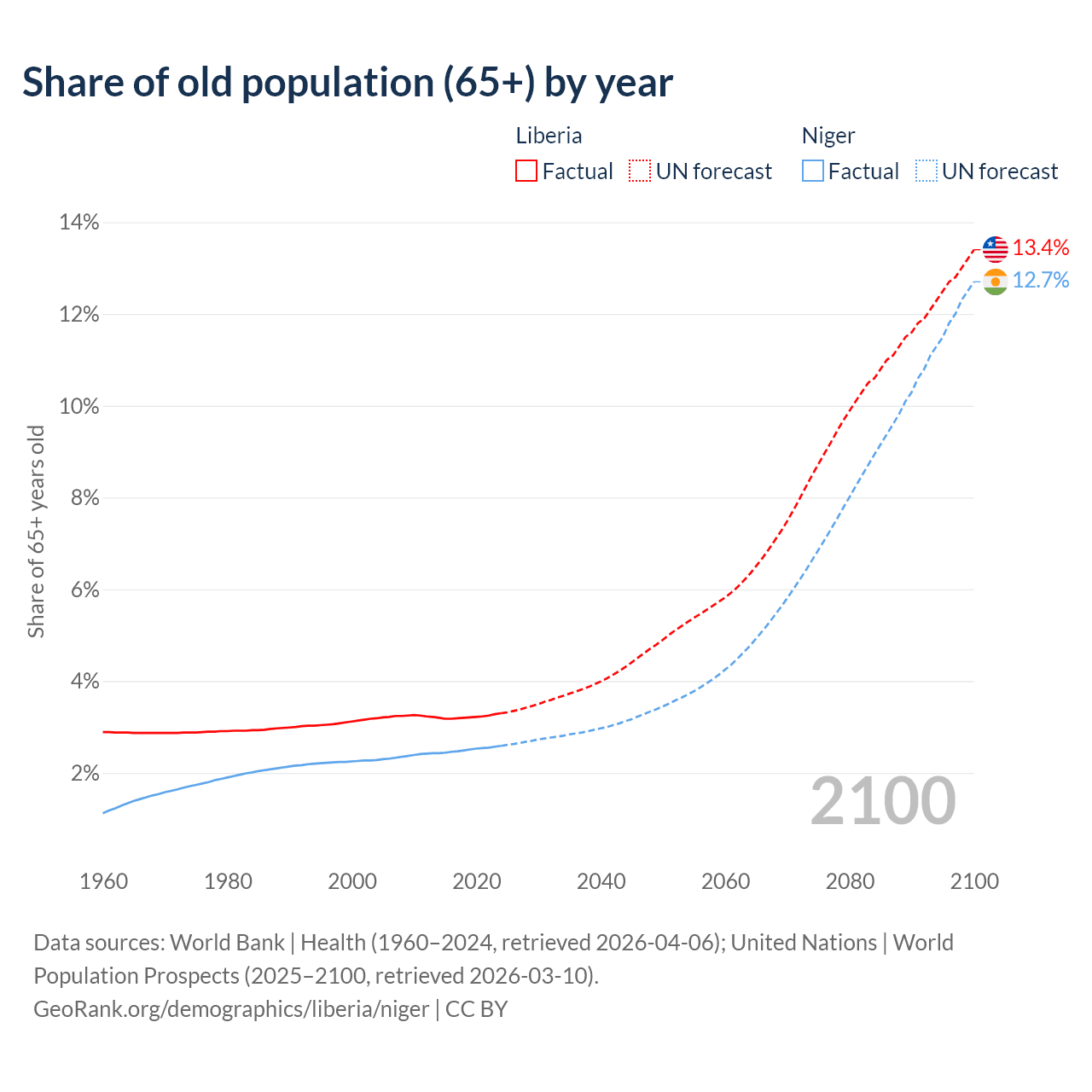 - The share of old-age demographic (65+) in Liberia is 3.3% vs 2.59% in Niger.