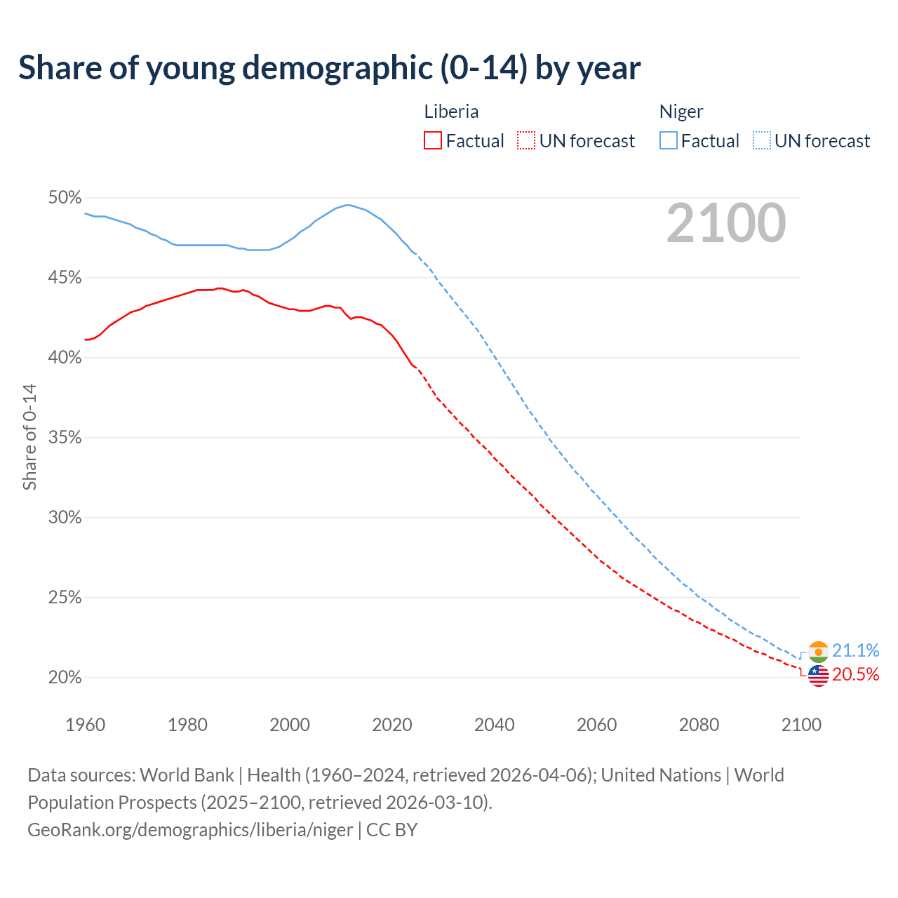 - The share of young demographic (0-15 years old) in Liberia is 39.5% vs 46.6% in Niger.