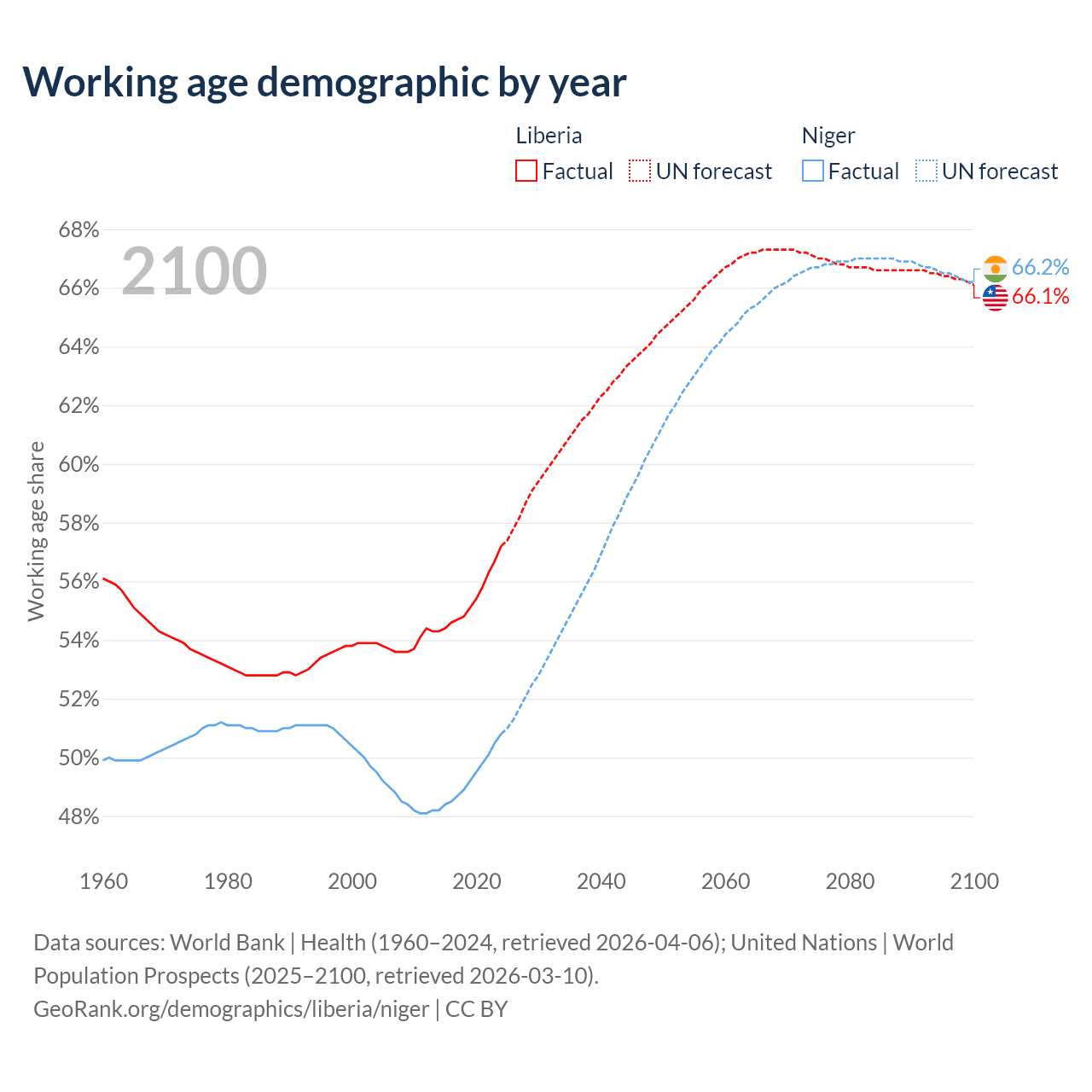 Median age Liberia vs Niger, 1960-2100