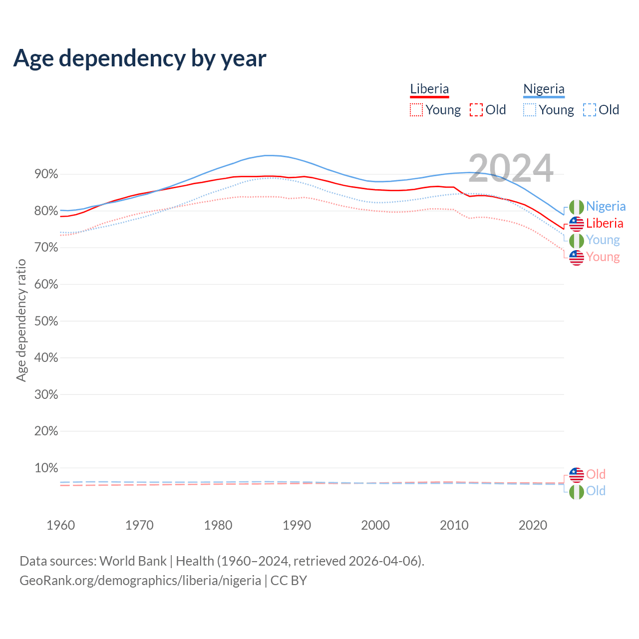Data sources: World Bank | Health (1960–2024, retrieved 2026-04-06); U.S. Census Bureau (1960–2024, retrieved 2026-02-08).