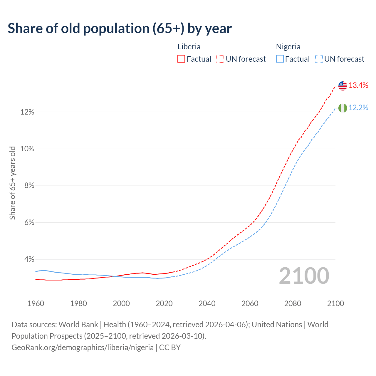 The share of older people aged 65 and over is 3.3% in Liberia and 3.05% in Nigeria. Life expectancy in Liberia compared to Nigeria .