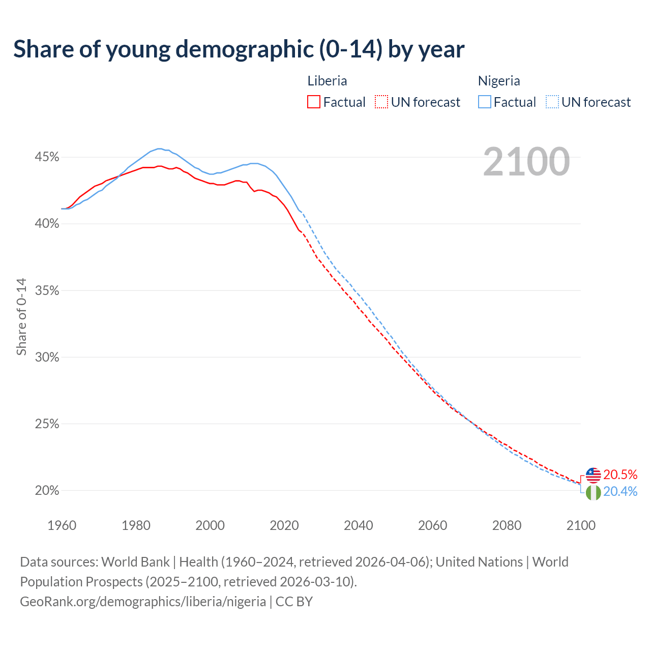 - The share of young demographic (0-15 years old) in Liberia is 39.5% vs 41% in Nigeria.
