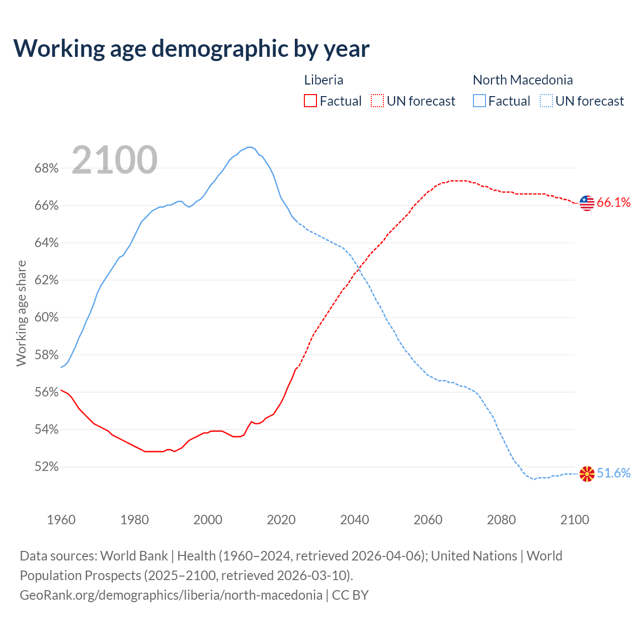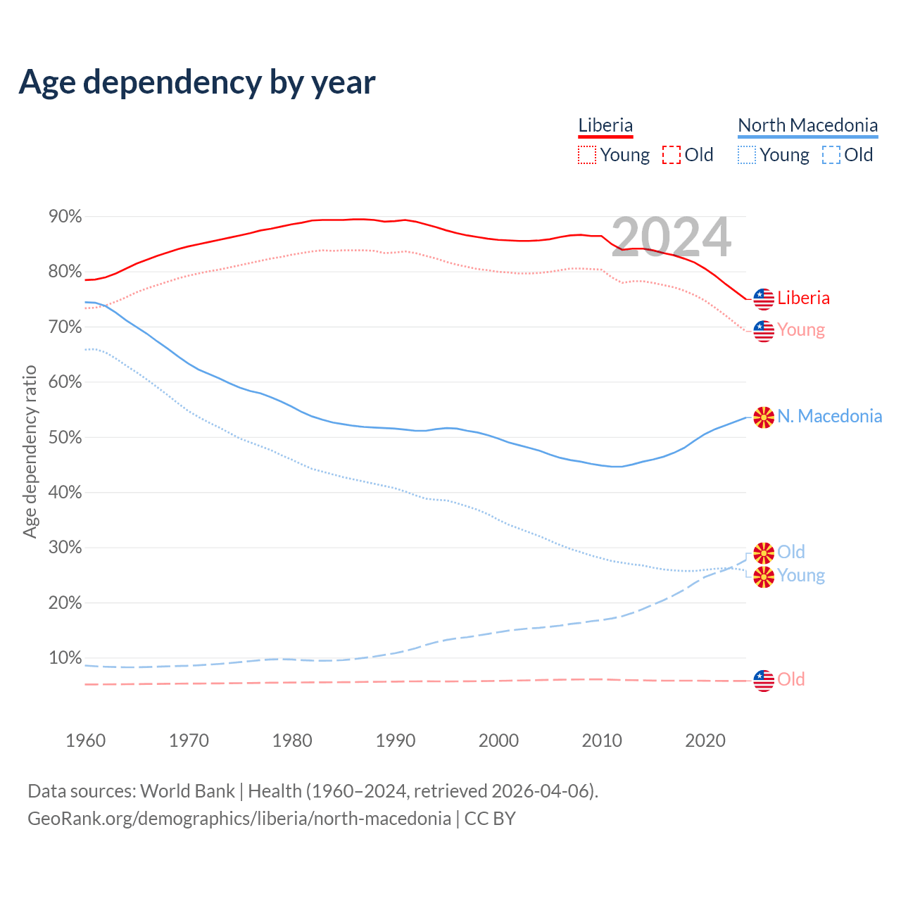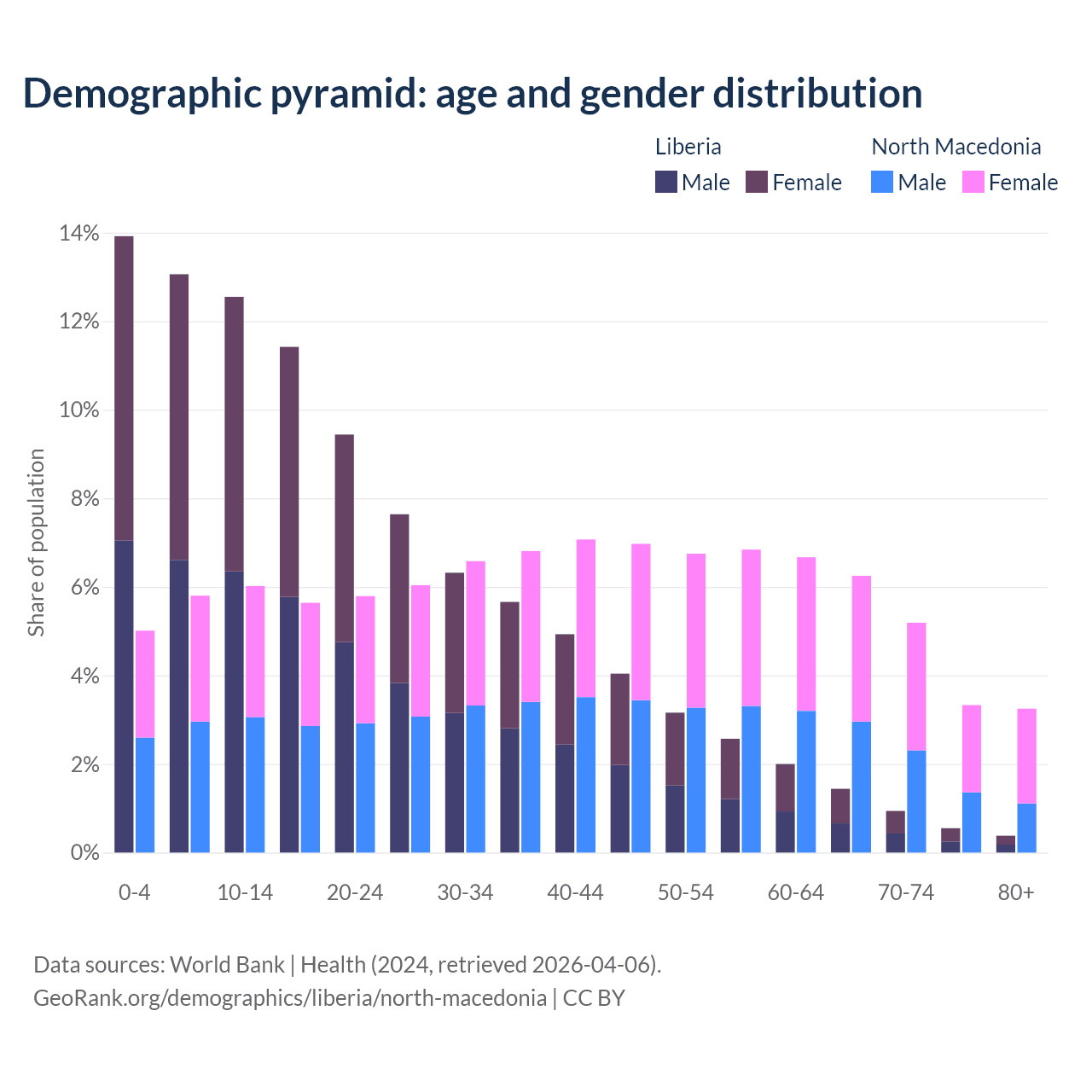The share of older people aged 65 and over is 3.3% in Liberia and 18% in North Macedonia. Life expectancy in Liberia compared to North Macedonia .