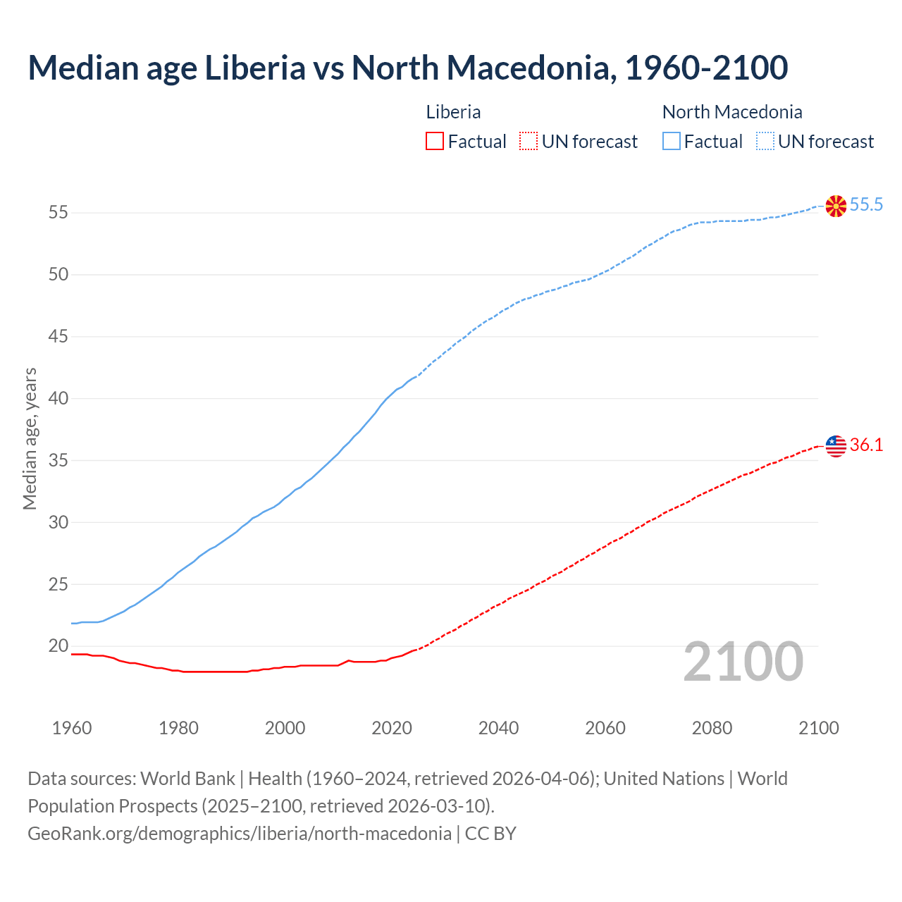 - Liberia is ranked 169/196 by median age (oldest to youngest) vs 37/196 for North Macedonia.