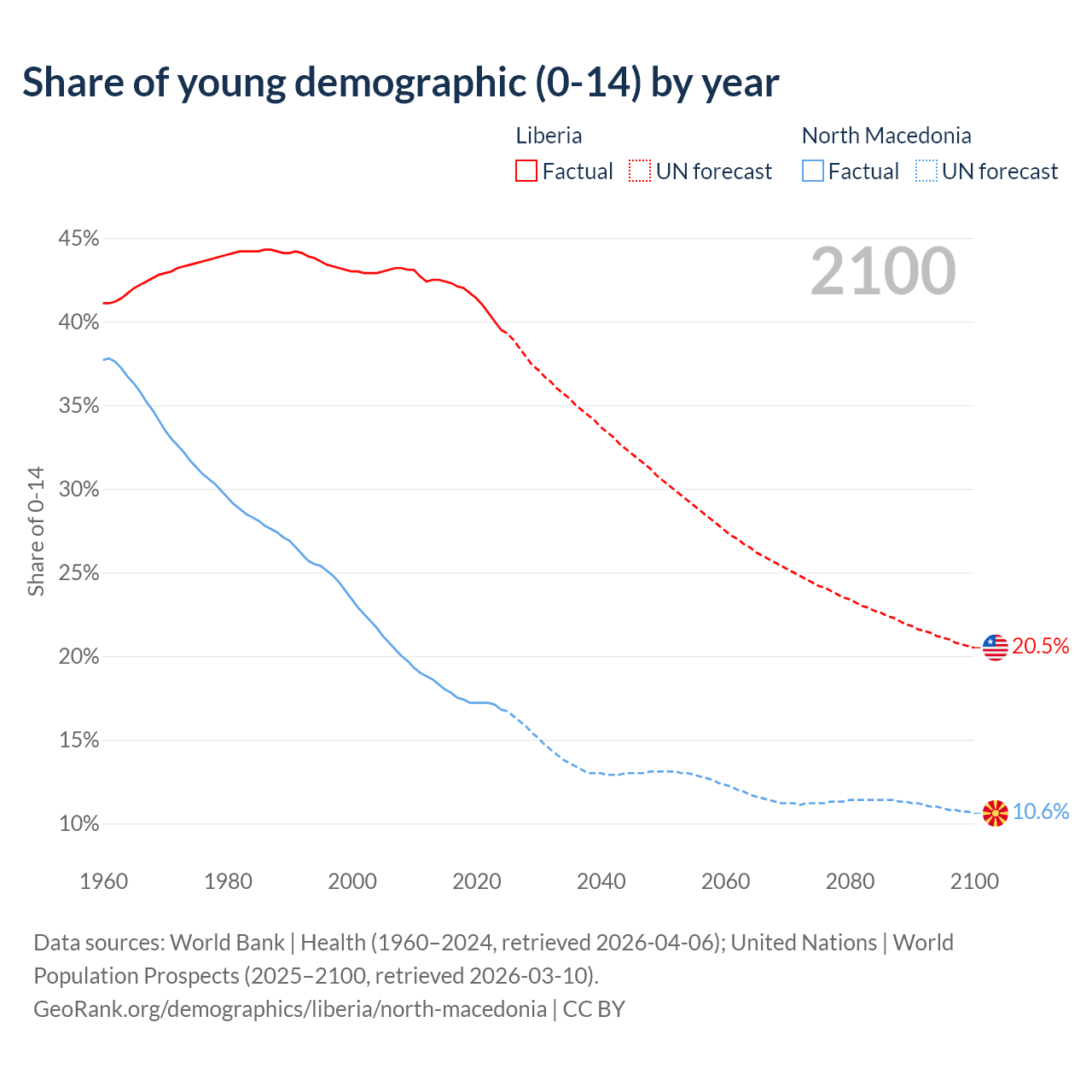 - The share of young demographic (0-15 years old) in Liberia is 39.5% vs 16.8% in North Macedonia.