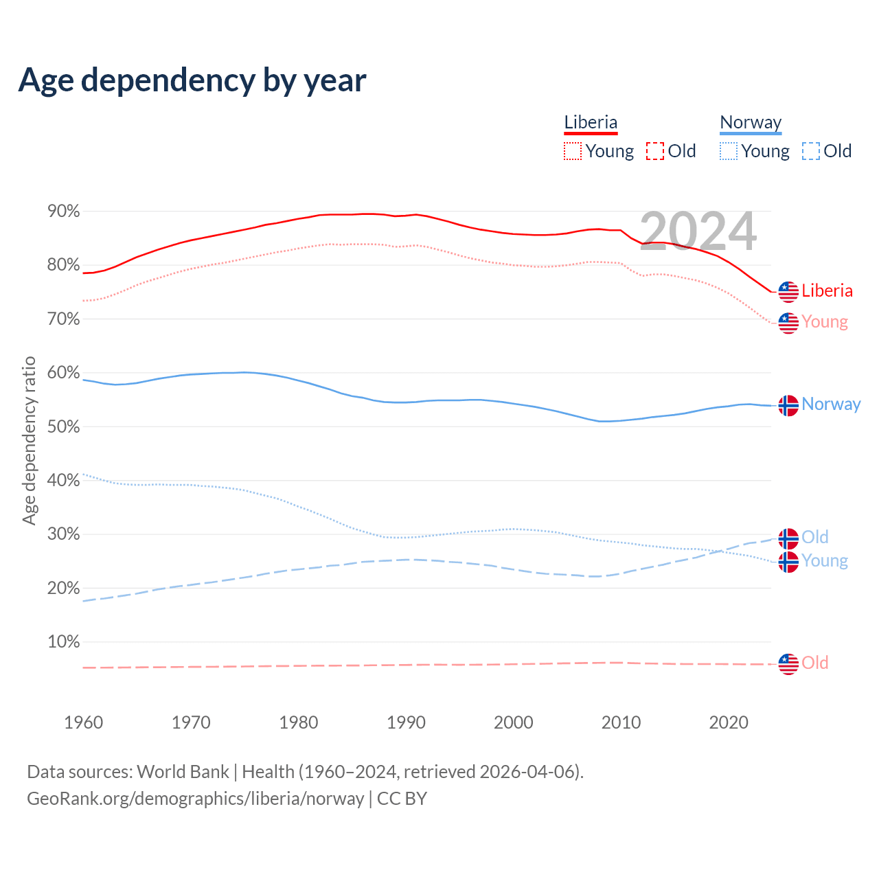 - The share of old-age demographic (65+) in Liberia is 3.3% vs 18.8% in Norway.