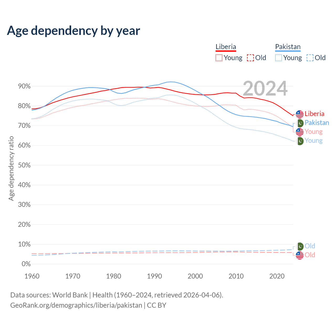 - Liberia is ranked 169/196 by median age (oldest to youngest) vs 154/196 for Pakistan.