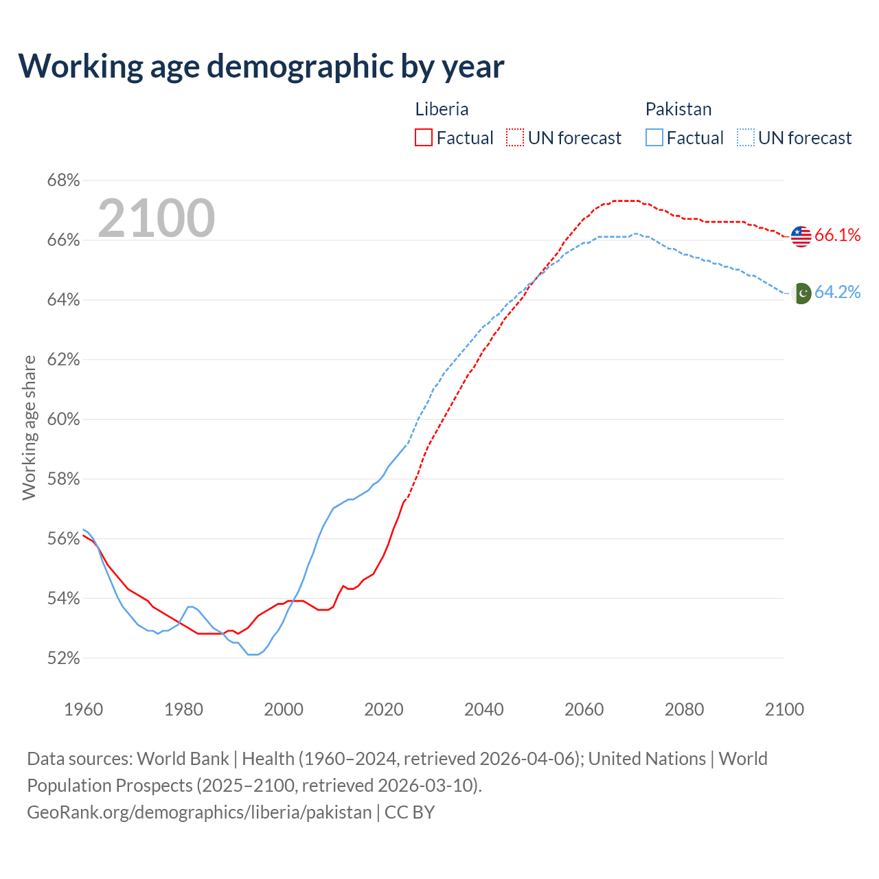 - Liberia has 3.37M working age adults (aged 15-64) vs 154M in Pakistan.