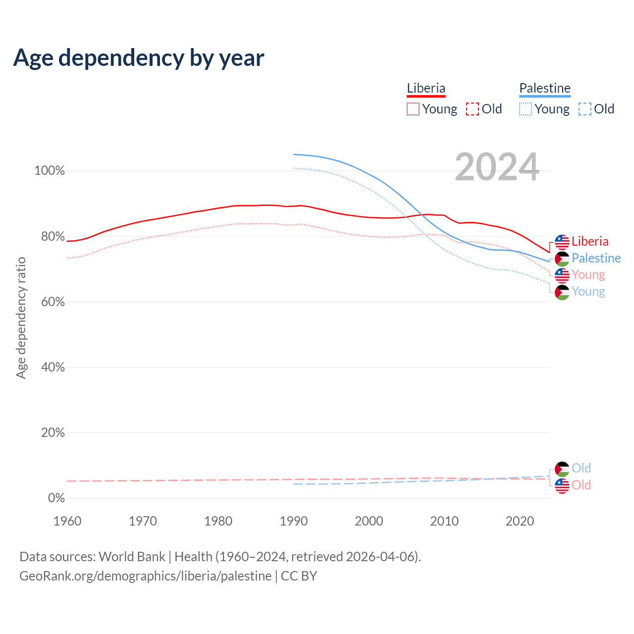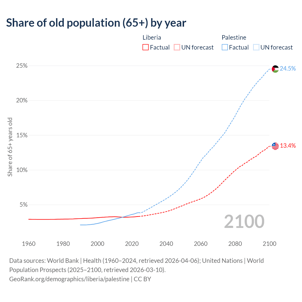 - The share of old-age demographic (65+) in Liberia is 3.3% vs 3.84% in Palestine.