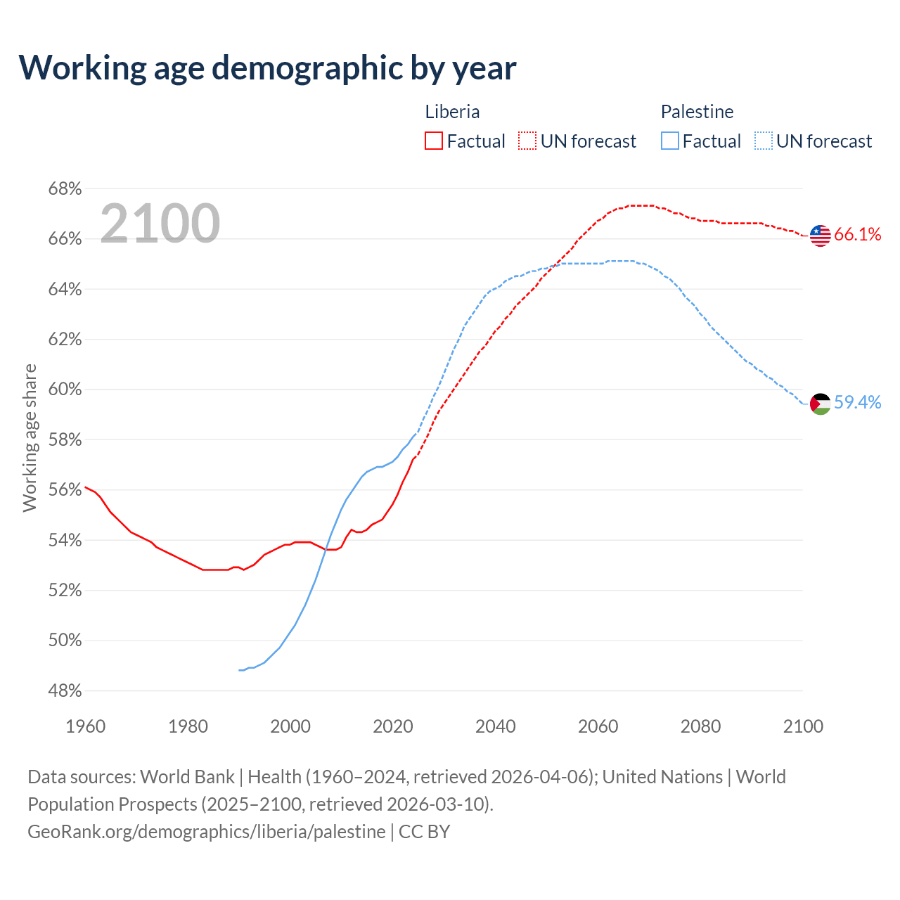 - Liberia has 3.37M working age adults (aged 15-64) vs 3.2M in Palestine.