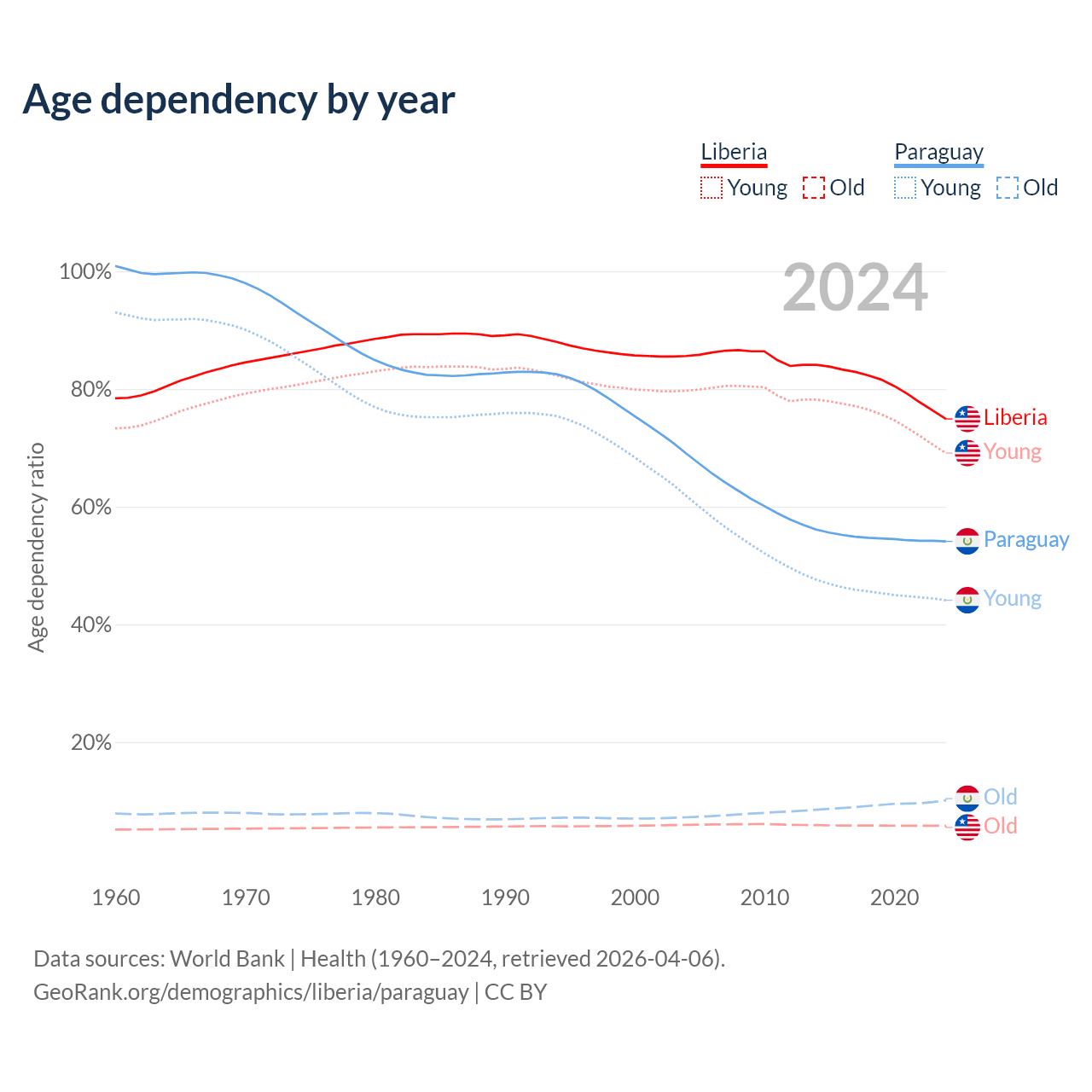 - Liberia is ranked 169/196 by median age (oldest to youngest) vs 118/196 for Paraguay.