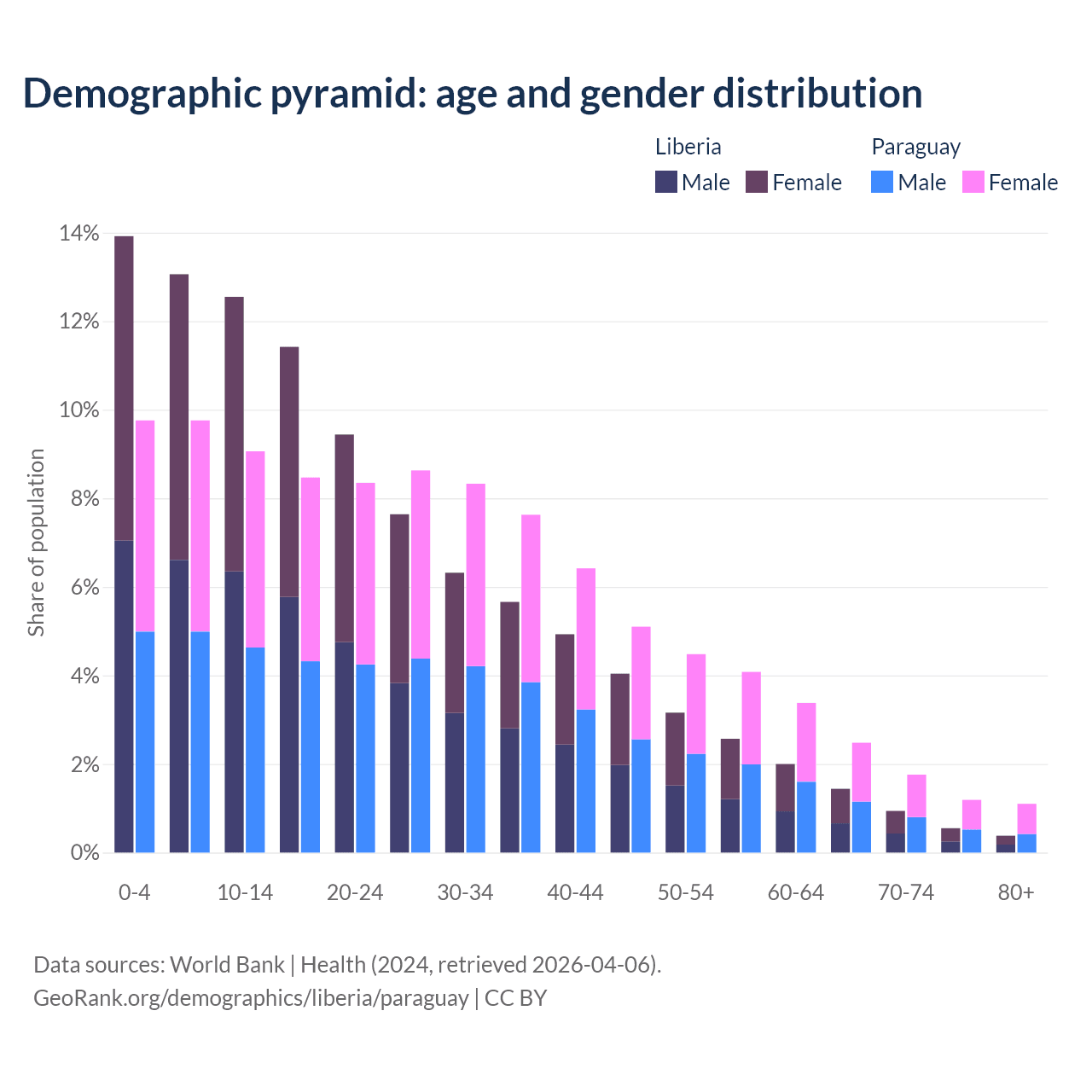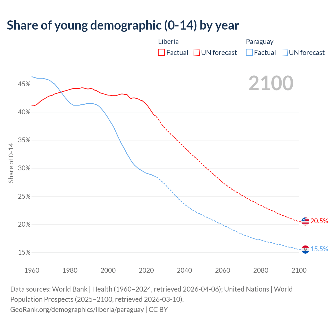 - The share of young demographic (0-15 years old) in Liberia is 39.5% vs 28.6% in Paraguay.