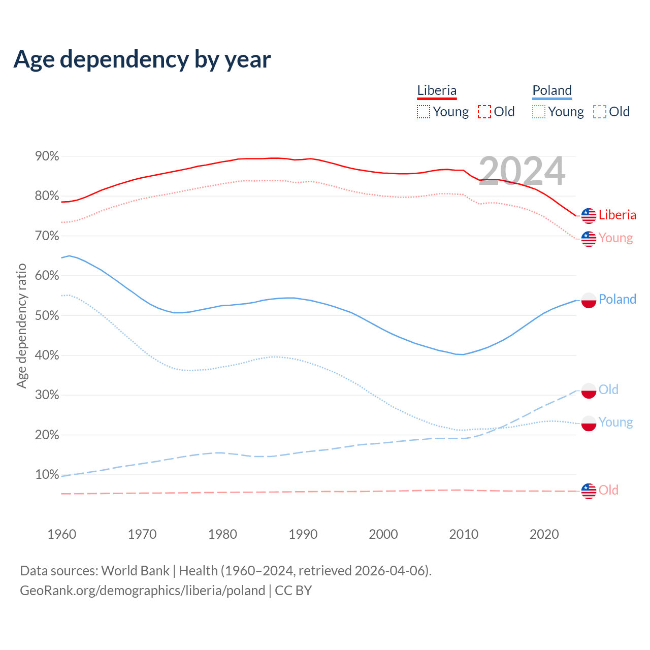 The share of older people aged 65 and over is 3.3% in Liberia and 20.1% in Poland. Life expectancy in Liberia compared to Poland .
