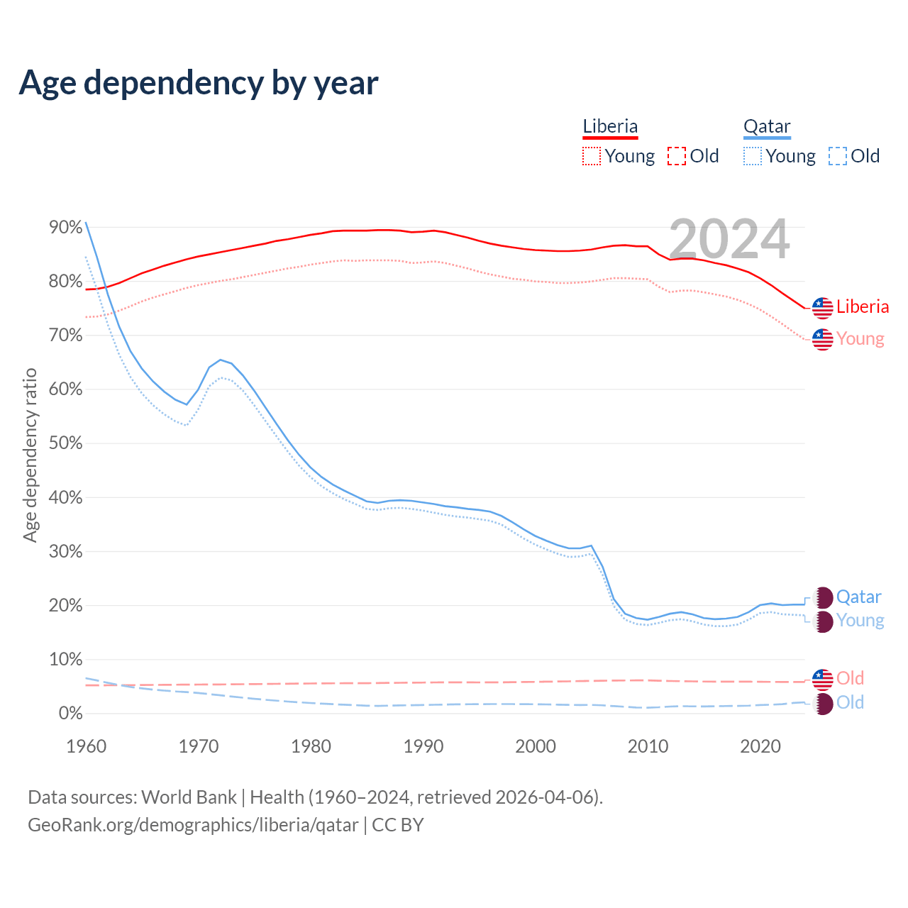 - Liberia is ranked 169/196 by median age (oldest to youngest) vs 78/196 for Qatar.