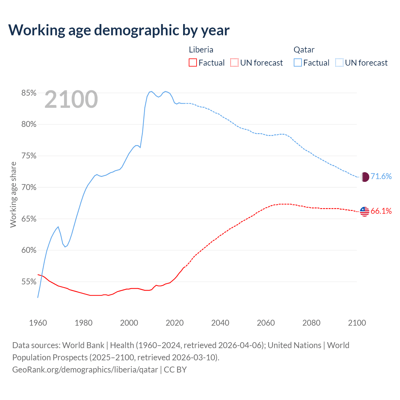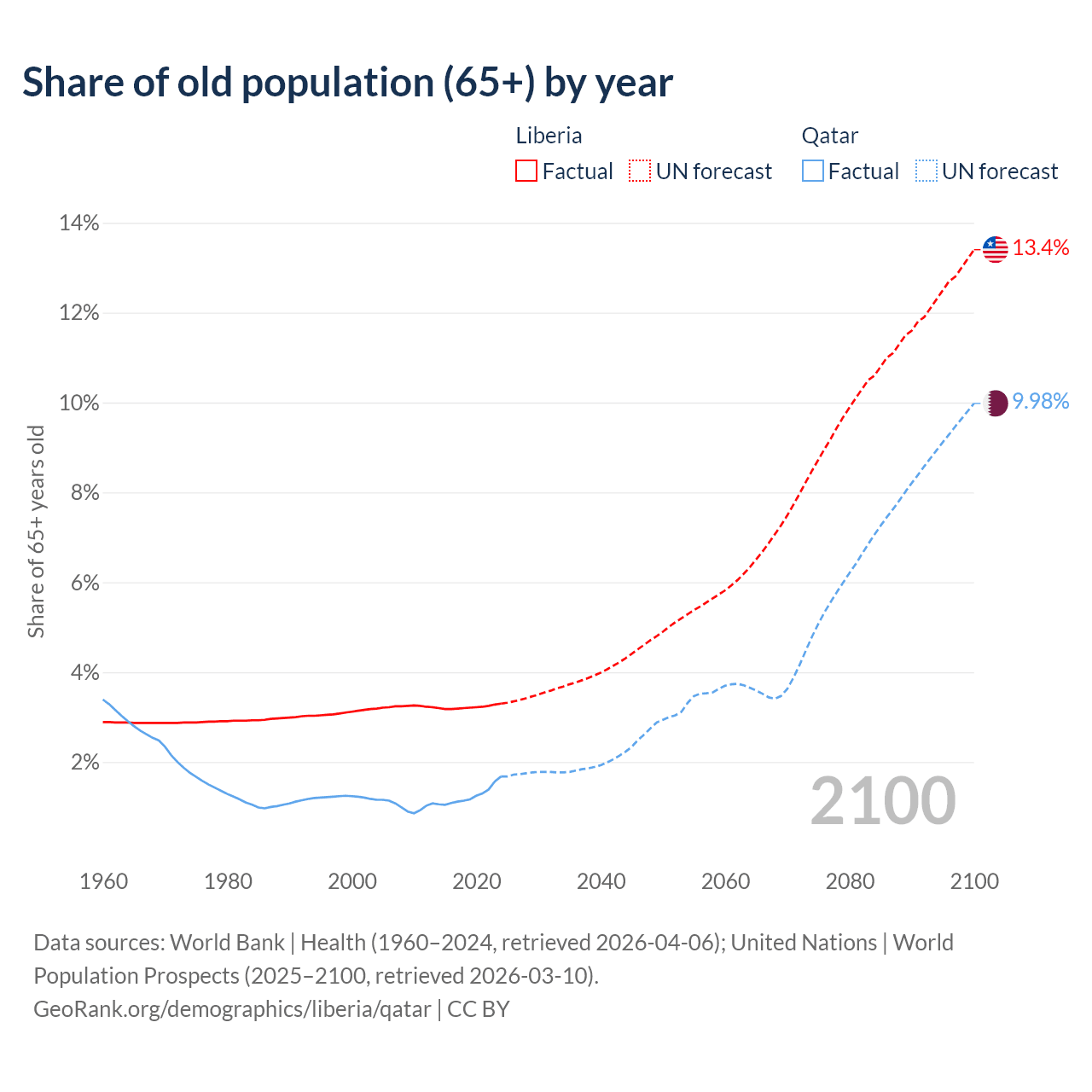 The share of older people aged 65 and over is 3.3% in Liberia and 1.68% in Qatar. Life expectancy in Liberia compared to Qatar .