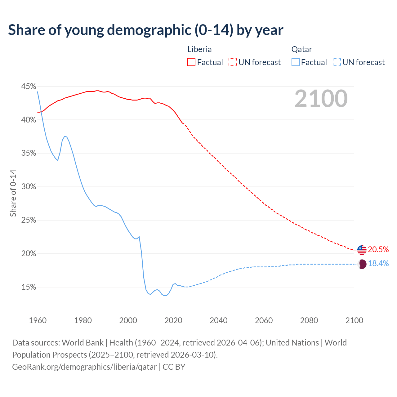 - The share of young demographic (0-15 years old) in Liberia is 39.5% vs 15.1% in Qatar.