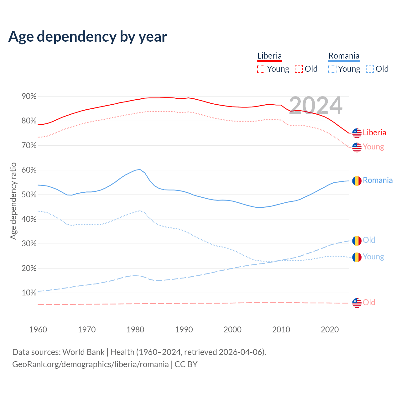 - Liberia is ranked 169/196 by median age (oldest to youngest) vs 23/196 for Romania.