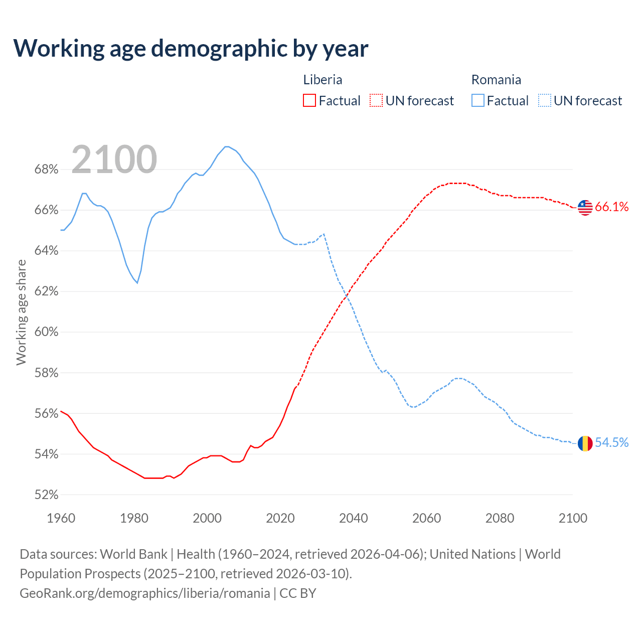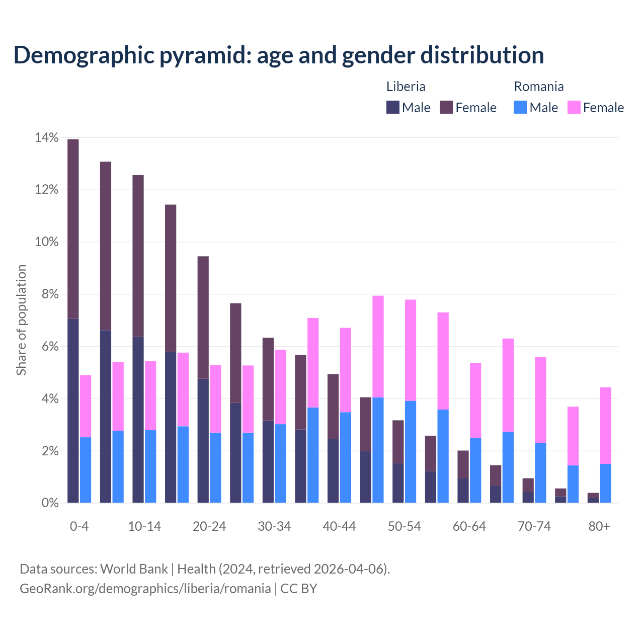 - As of 2026, the population of Liberia is 5.89M vs 18.8M in Romania - 3.2 times difference.