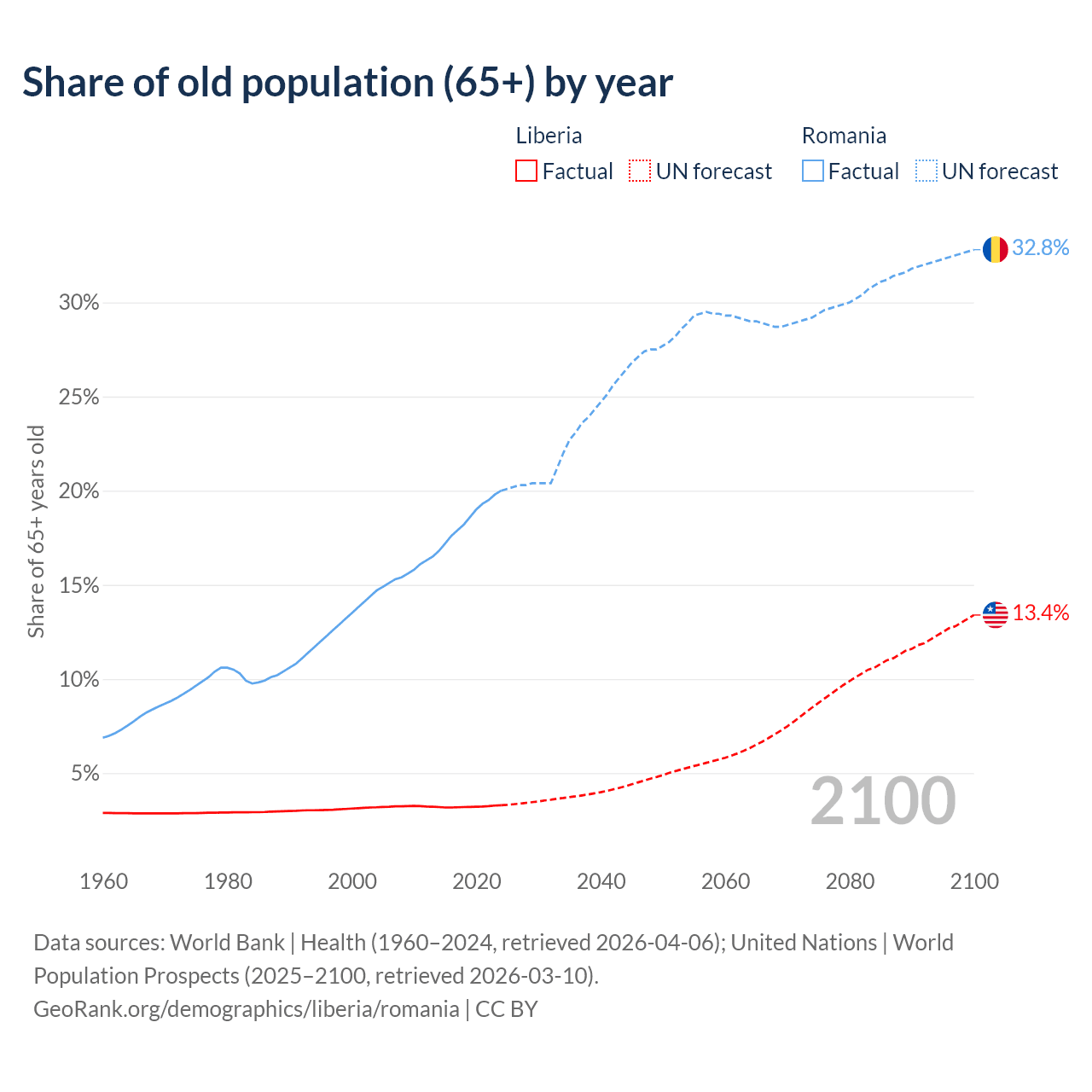 The share of older people aged 65 and over is 3.3% in Liberia and 20% in Romania. Life expectancy in Liberia compared to Romania .