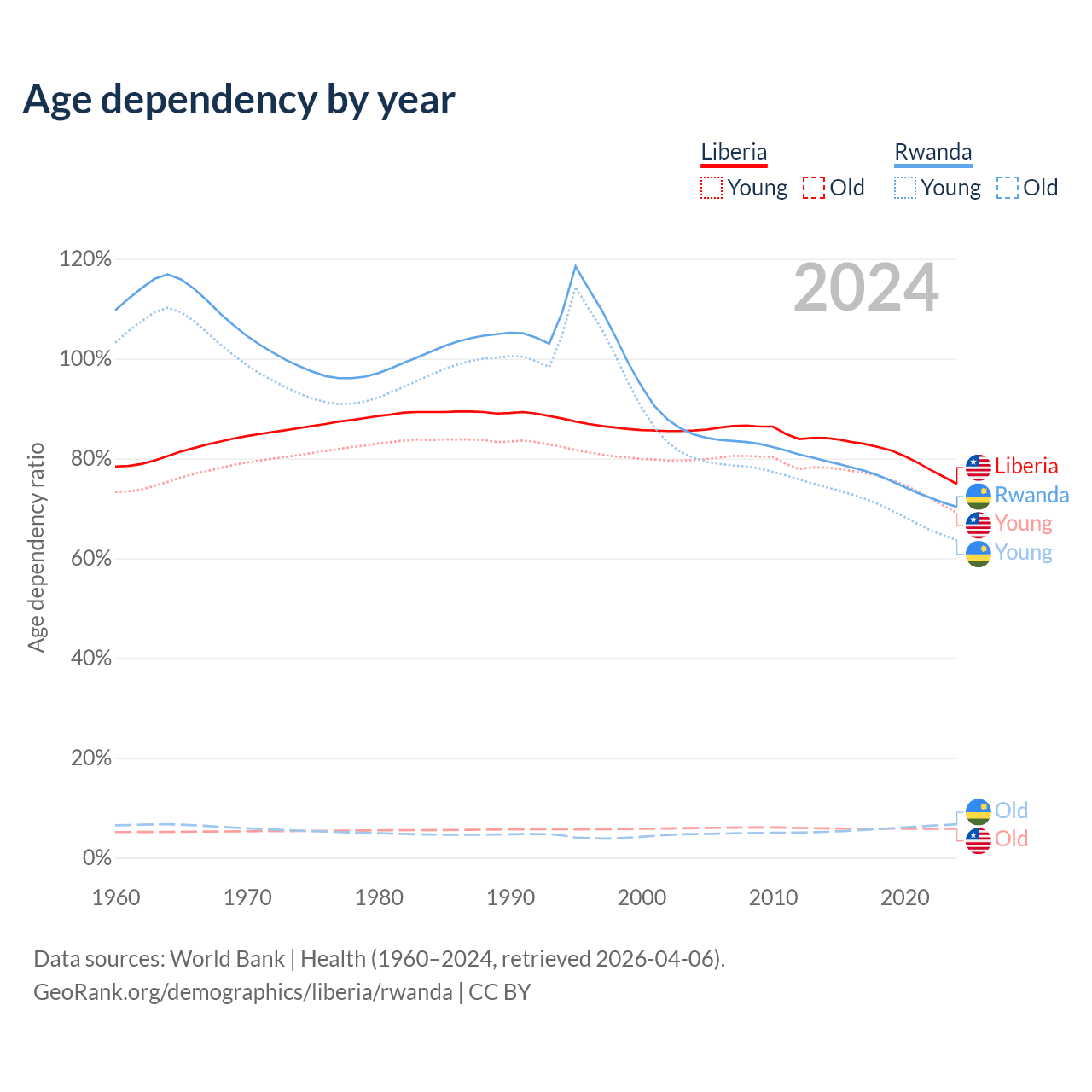 - Liberia is ranked 169/196 by median age (oldest to youngest) vs 160/196 for Rwanda.