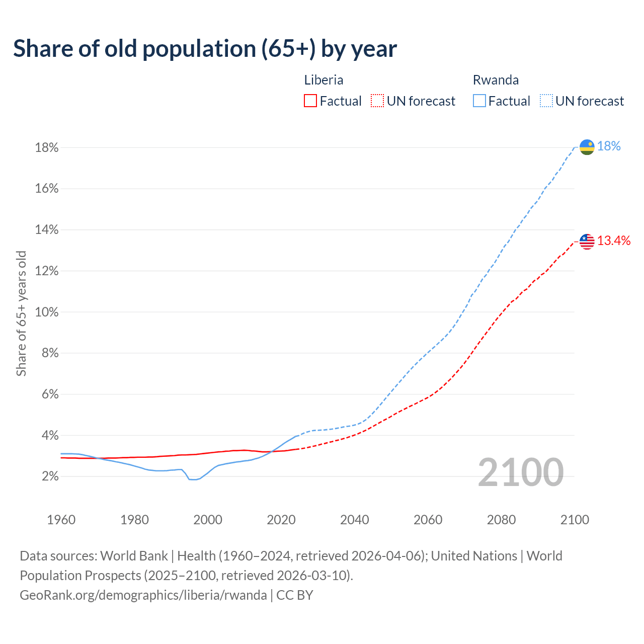 The share of older people aged 65 and over is 3.3% in Liberia and 3.93% in Rwanda. Life expectancy in Liberia compared to Rwanda .