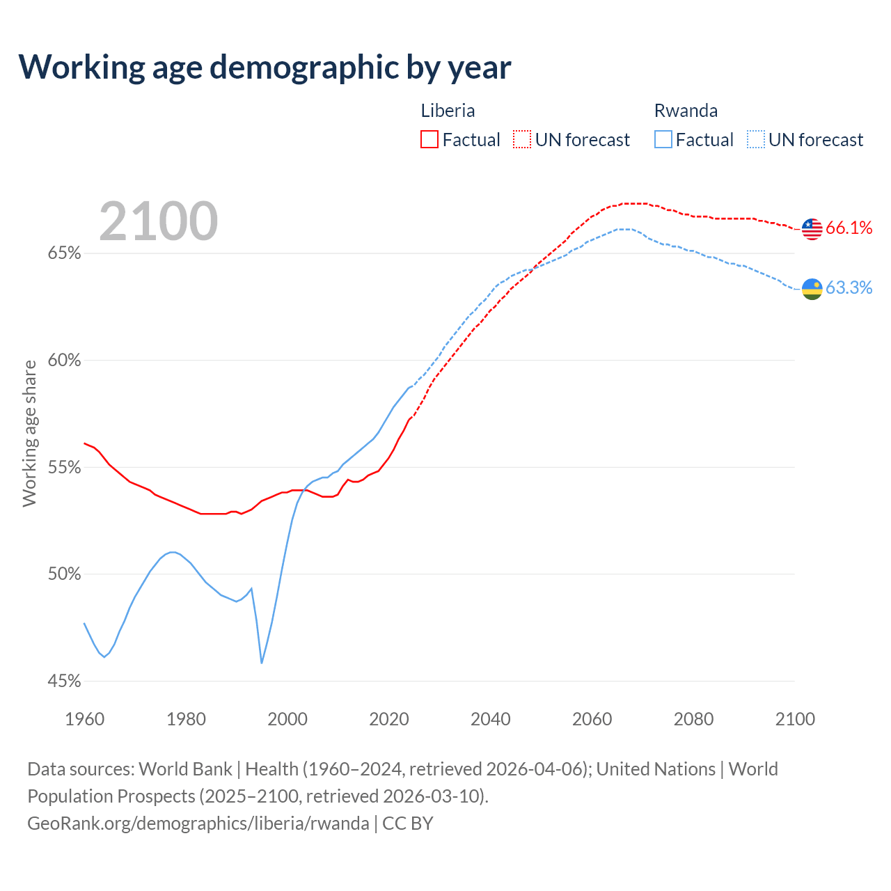 - Liberia has 3.37M working age adults (aged 15-64) vs 8.79M in Rwanda.