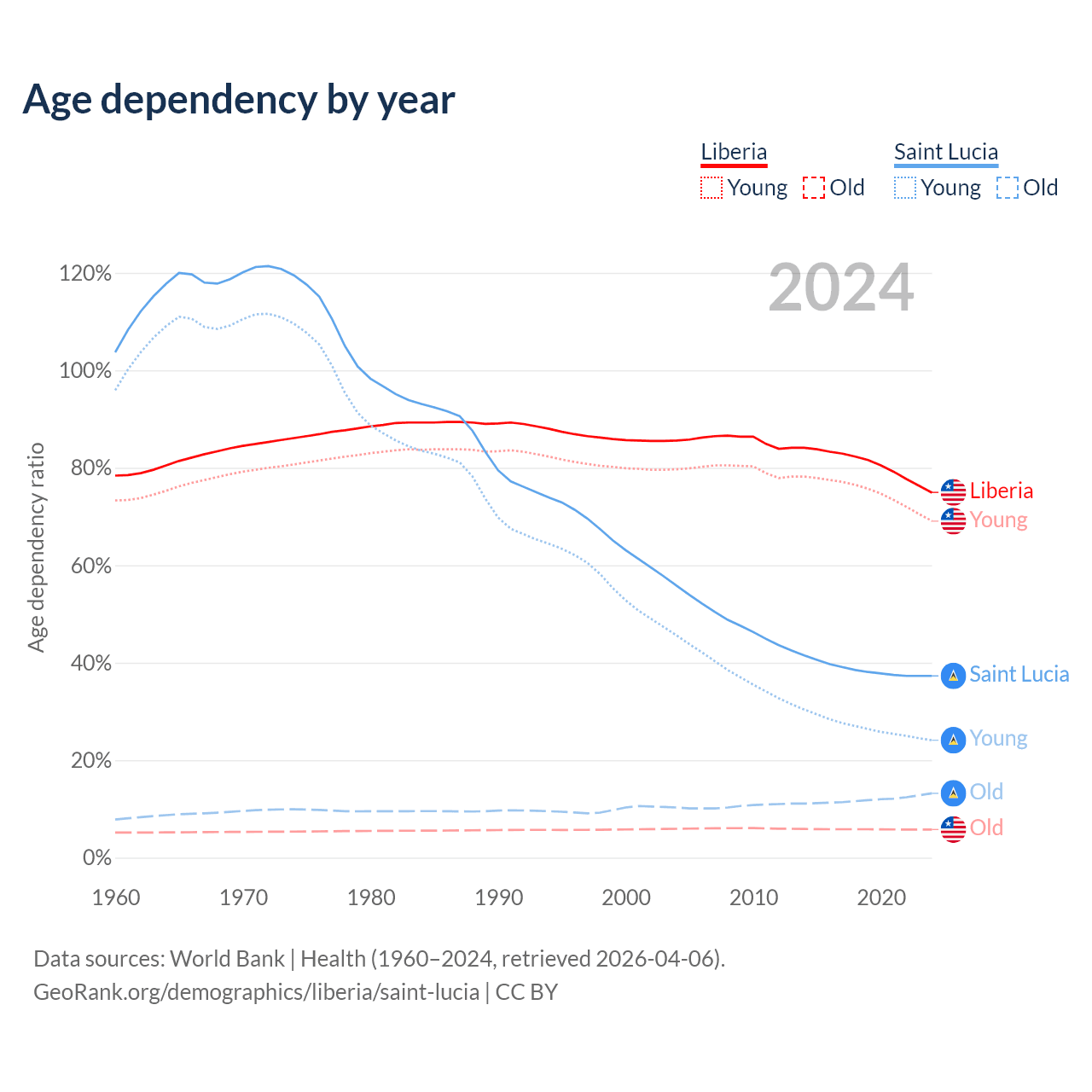 - The share of young demographic (0-15 years old) in Liberia is 39.5% vs 17.5% in Saint Lucia.
