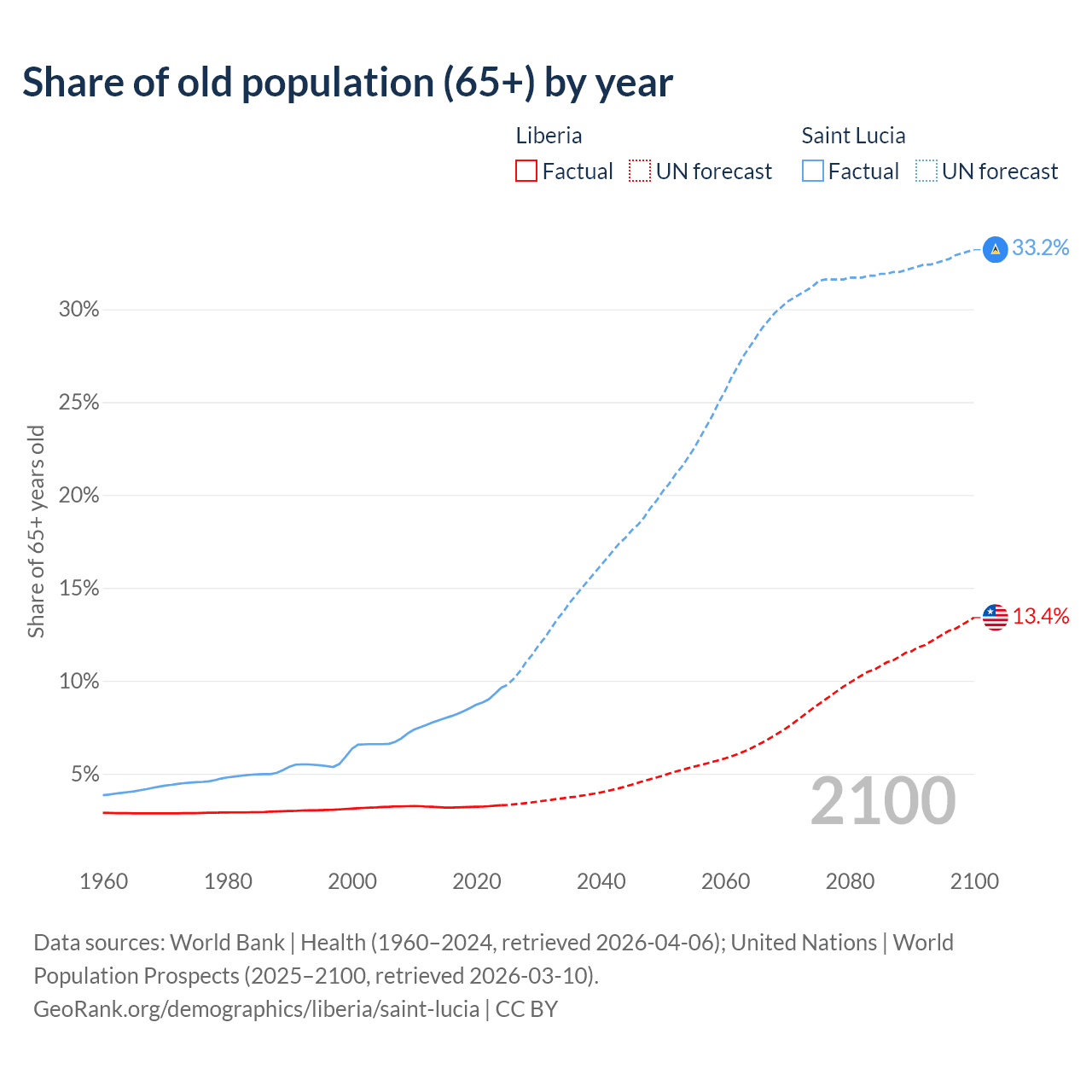 - The share of old-age demographic (65+) in Liberia is 3.3% vs 9.62% in Saint Lucia.