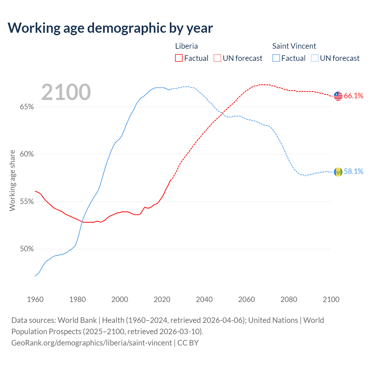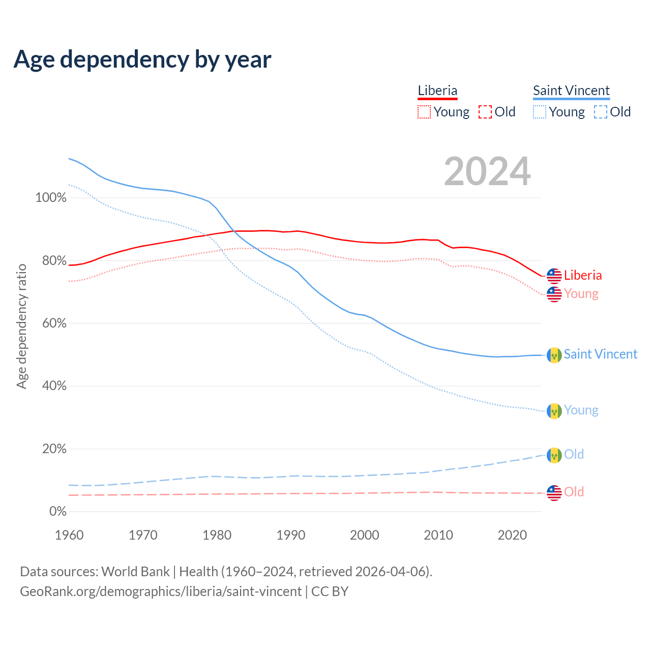 - The share of young demographic (0-15 years old) in Liberia is 39.5% vs 21.3% in Saint Vincent.