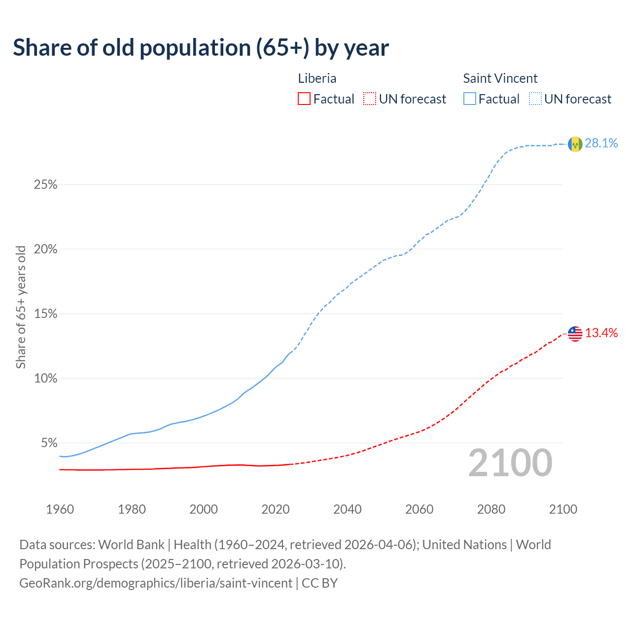 The share of older people aged 65 and over is 3.3% in Liberia and 11.9% in Saint Vincent. Life expectancy in Liberia compared to Saint Vincent .
