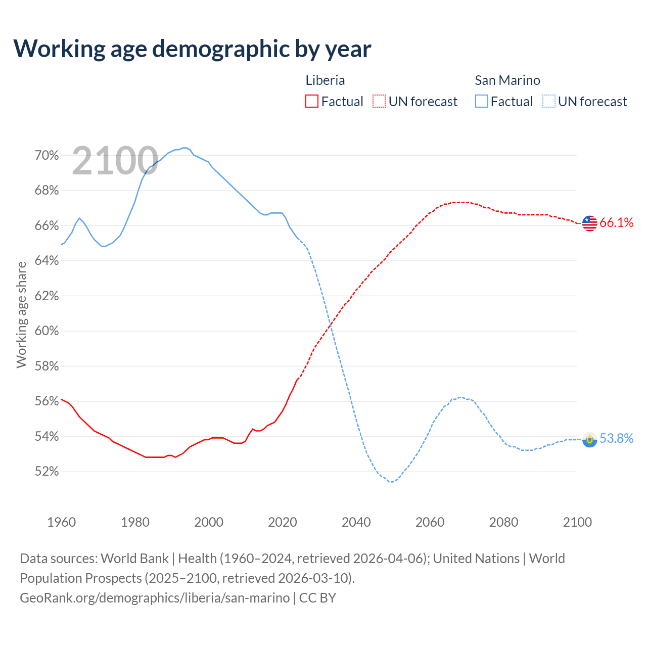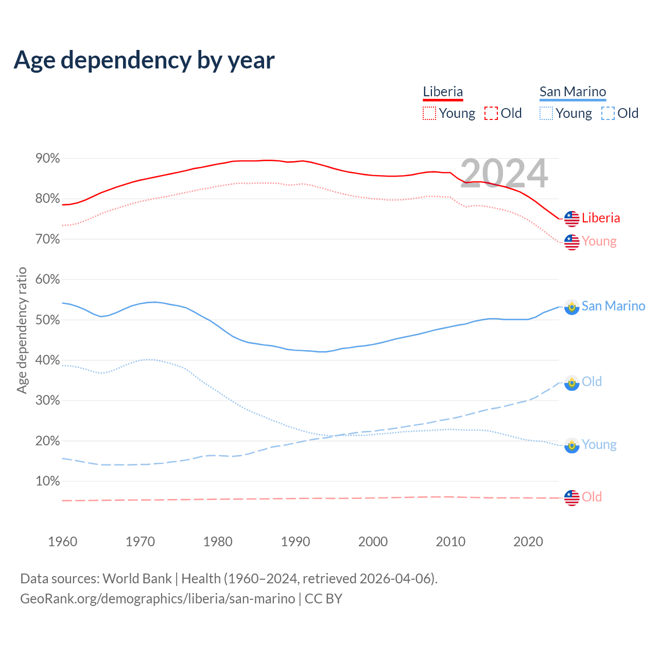 - The share of old-age demographic (65+) in Liberia is 3.3% vs 22.4% in San Marino.