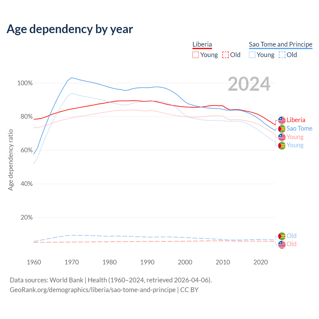 - Liberia is ranked 169/196 by median age (oldest to youngest) vs 163/196 for Sao Tome and Principe.