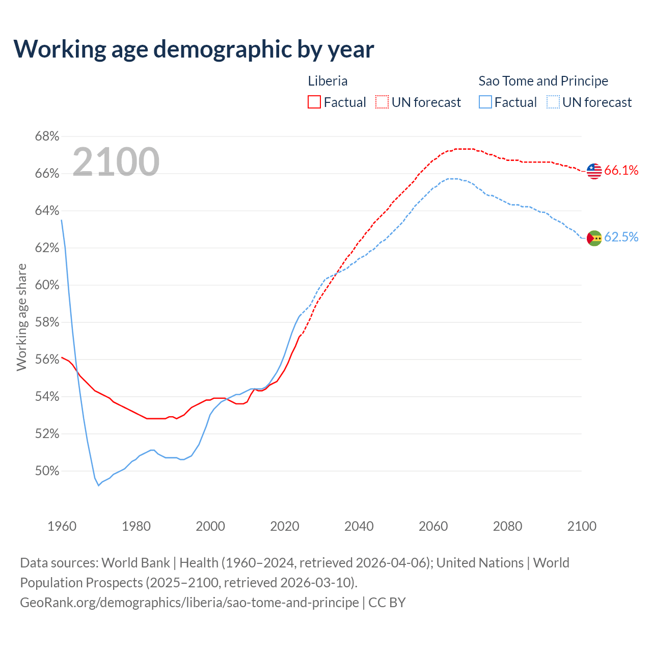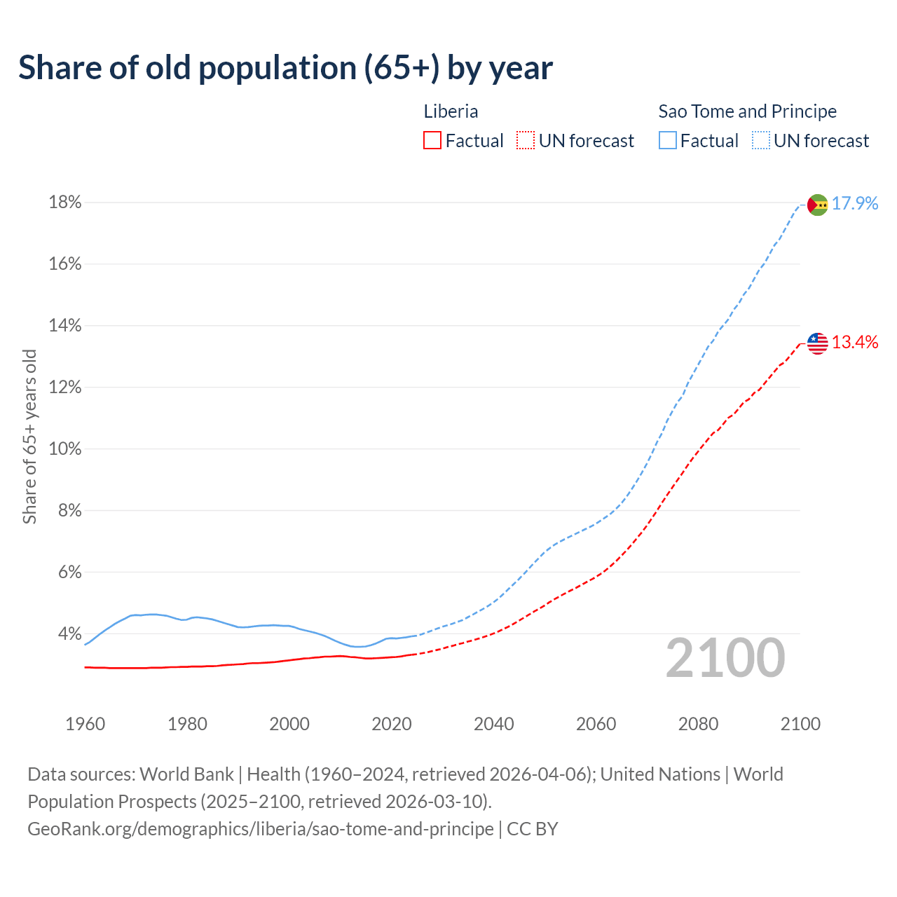 The share of older people aged 65 and over is 3.3% in Liberia and 3.9% in Sao Tome and Principe. Life expectancy in Liberia compared to Sao Tome and Principe .