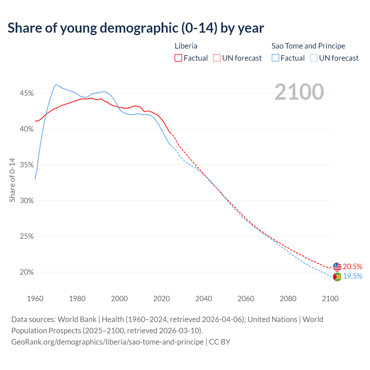 - The share of young demographic (0-15 years old) in Liberia is 39.5% vs 37.8% in Sao Tome and Principe.