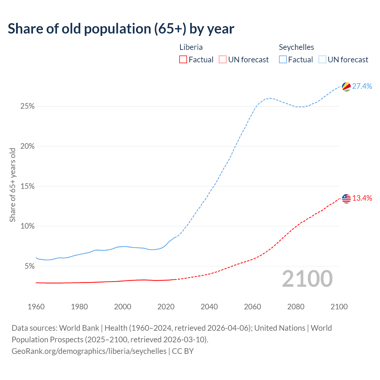 The share of older people aged 65 and over is 3.3% in Liberia and 8.54% in the Seychelles. Life expectancy in Liberia compared to the Seychelles .