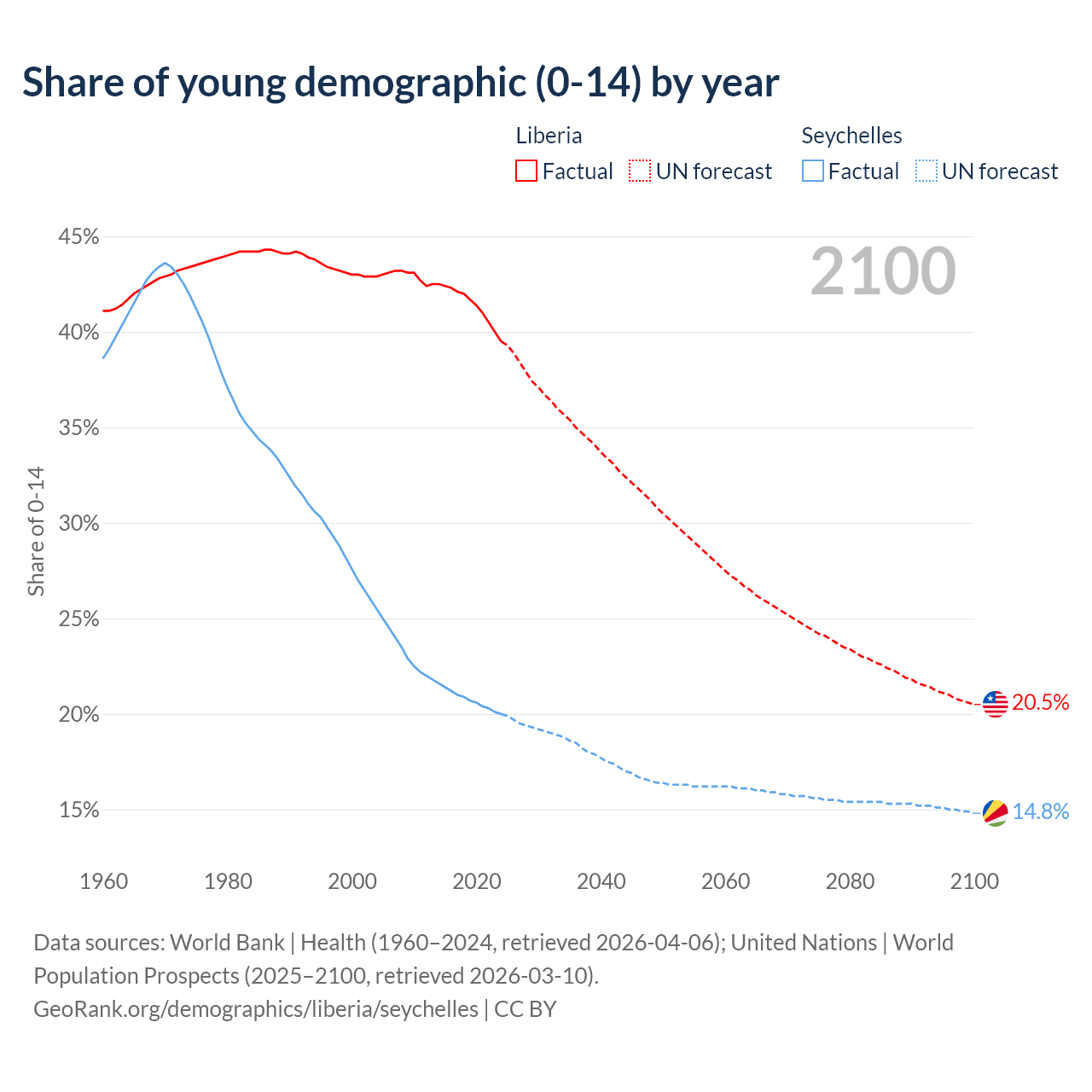 - The share of young demographic (0-15 years old) in Liberia is 39.5% vs 20% in the Seychelles.
