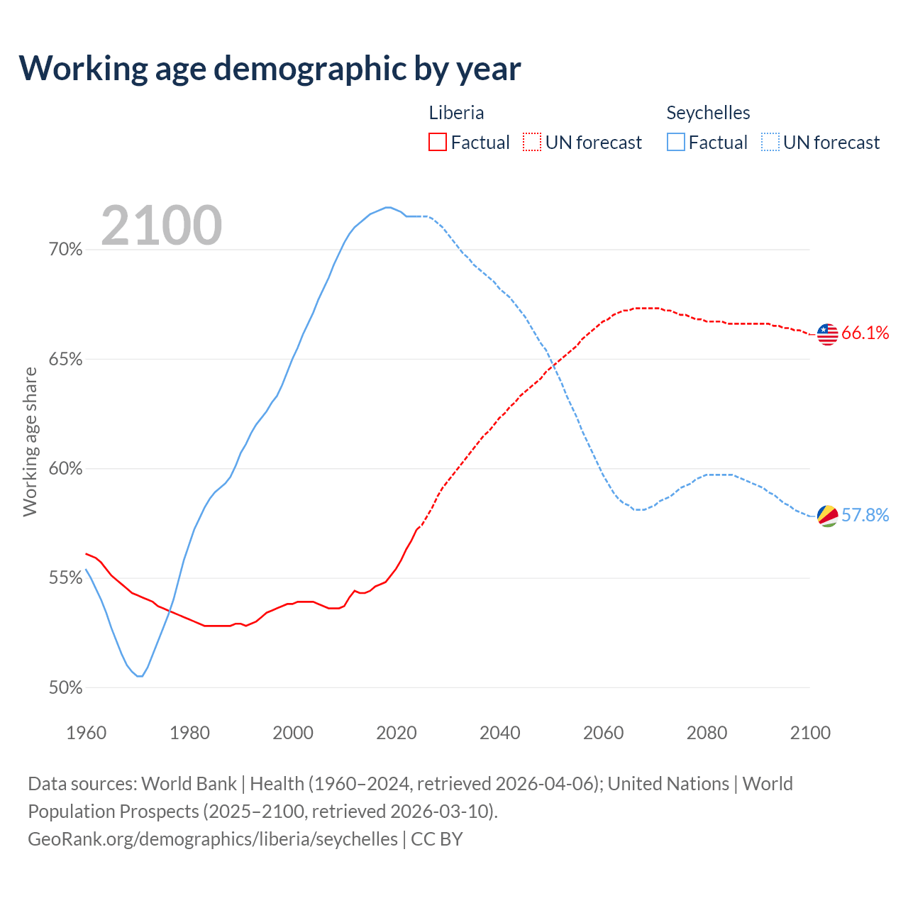 - Liberia has 3.37M working age adults (aged 15-64) vs 90.3K in the Seychelles.