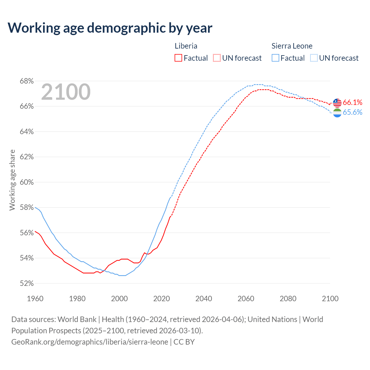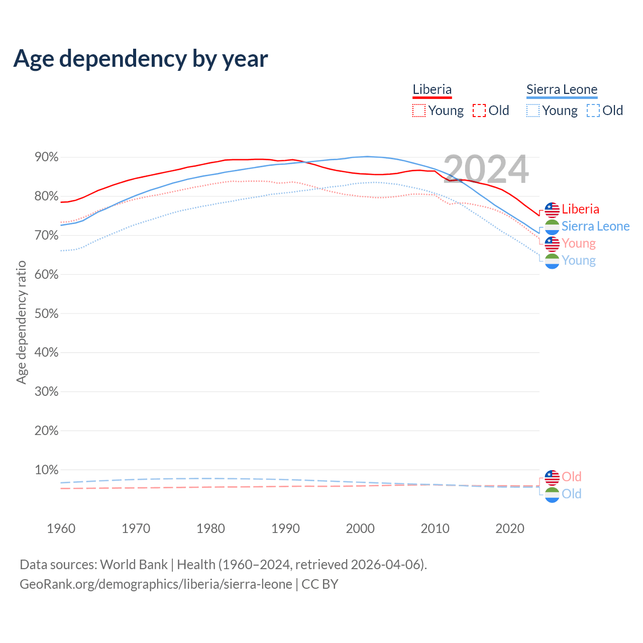 The share of older people aged 65 and over is 3.3% in Liberia and 3.24% in Sierra Leone. Life expectancy in Liberia compared to Sierra Leone .