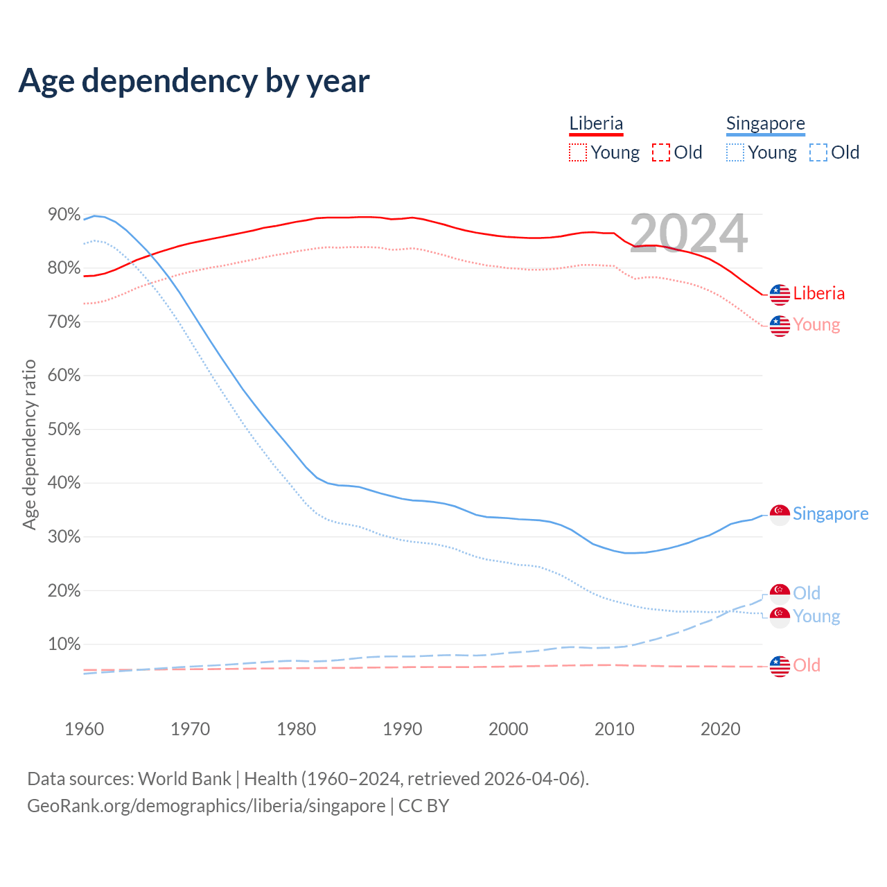 - Liberia is ranked 169/196 by median age (oldest to youngest) vs 68/196 for Singapore.