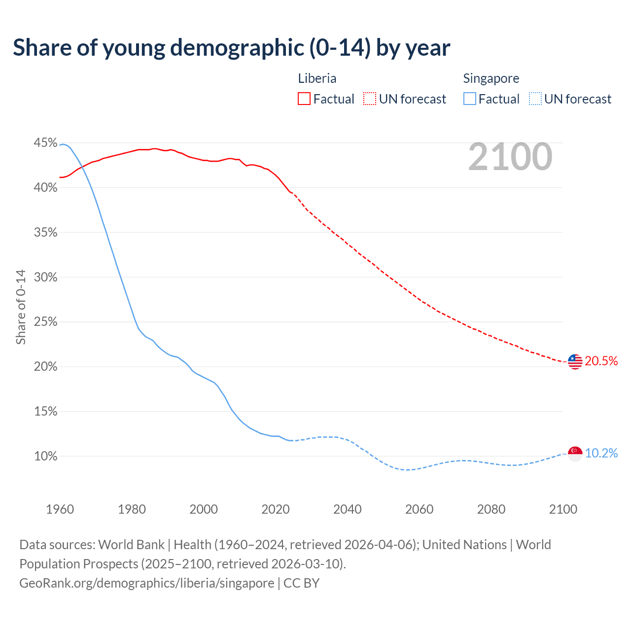 - The share of young demographic (0-15 years old) in Liberia is 39.5% vs 11.7% in Singapore.