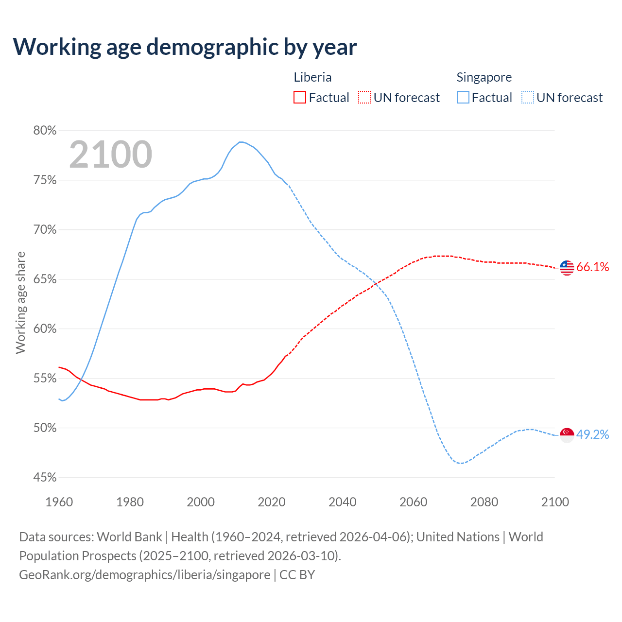 - Liberia has 3.37M working age adults (aged 15-64) vs 4.57M in Singapore.