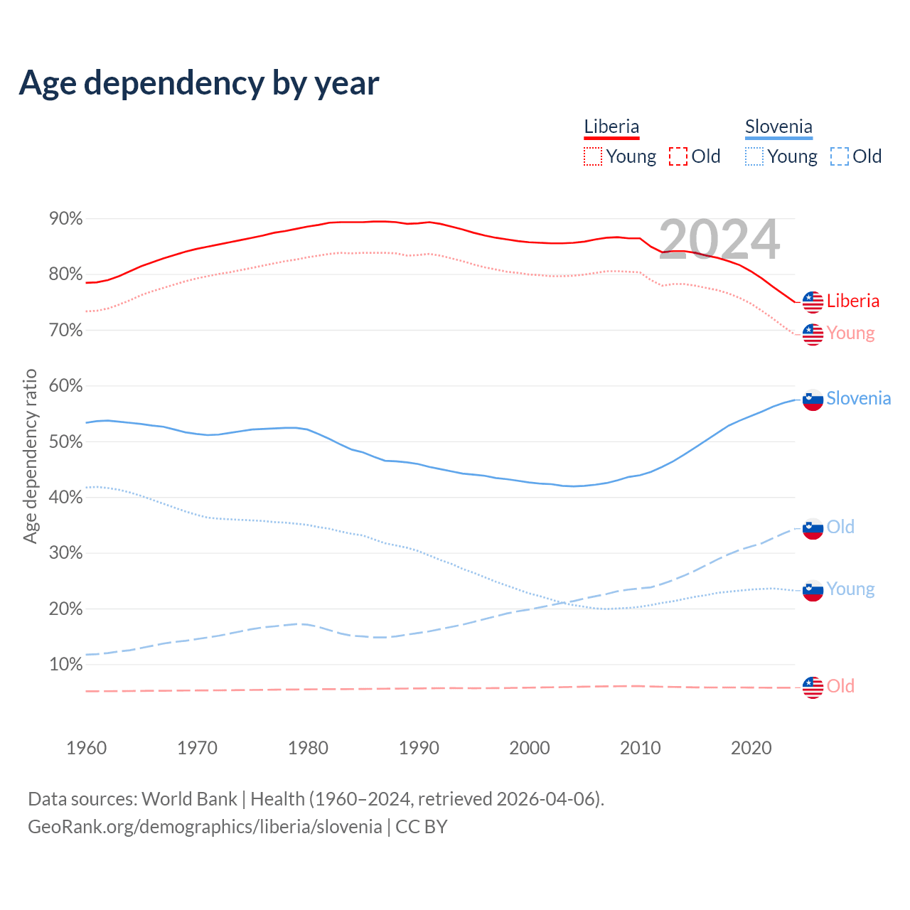 - The share of old-age demographic (65+) in Liberia is 3.3% vs 21.8% in Slovenia.