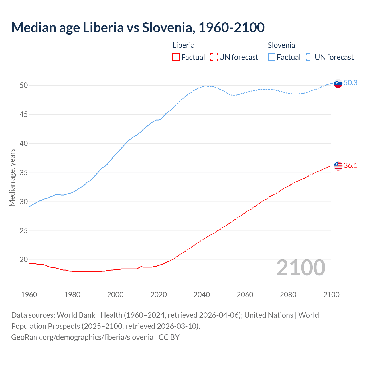 - Liberia is ranked 169/196 by median age (oldest to youngest) vs 14/196 for Slovenia.