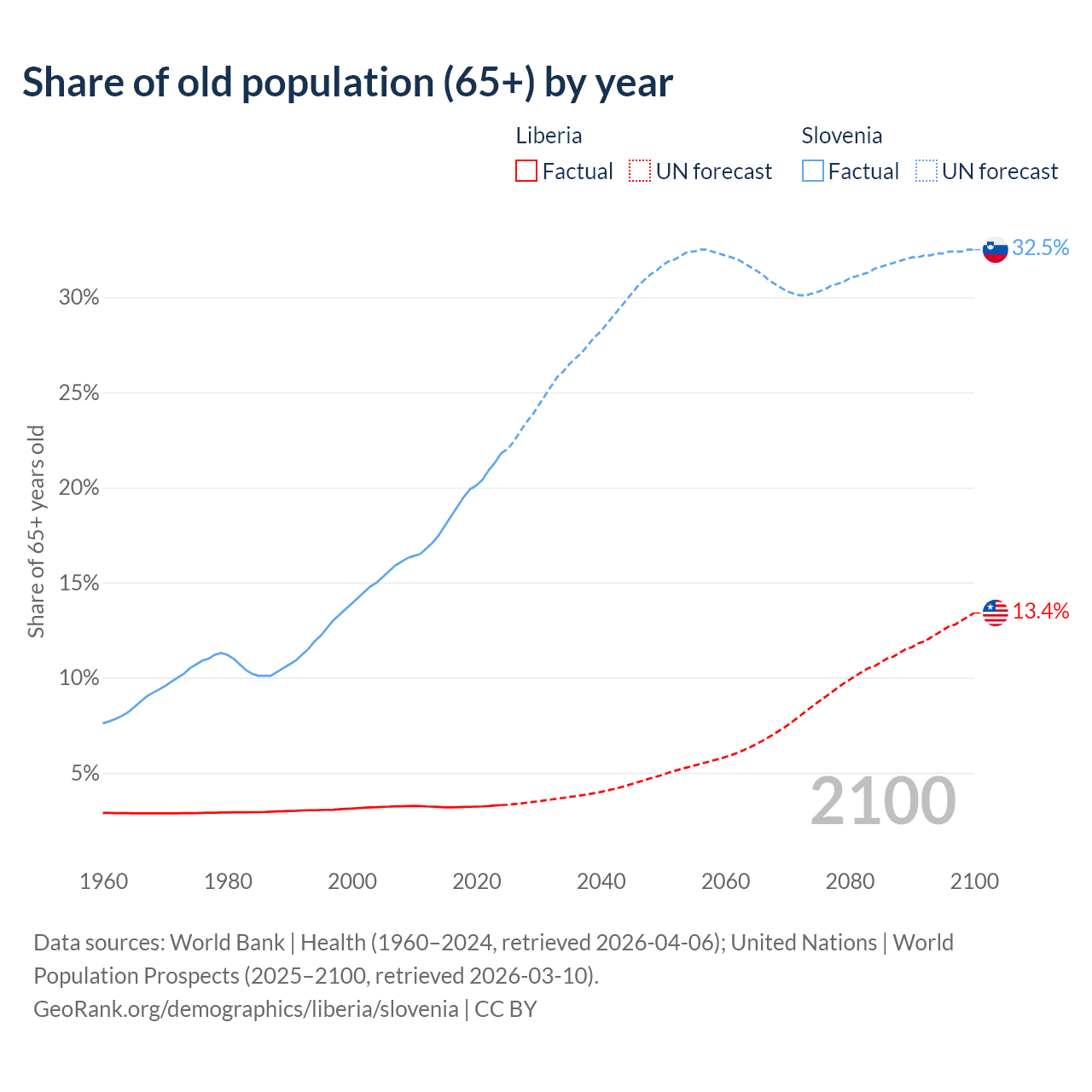 The share of older people aged 65 and over is 3.3% in Liberia and 21.8% in Slovenia. Life expectancy in Liberia compared to Slovenia .