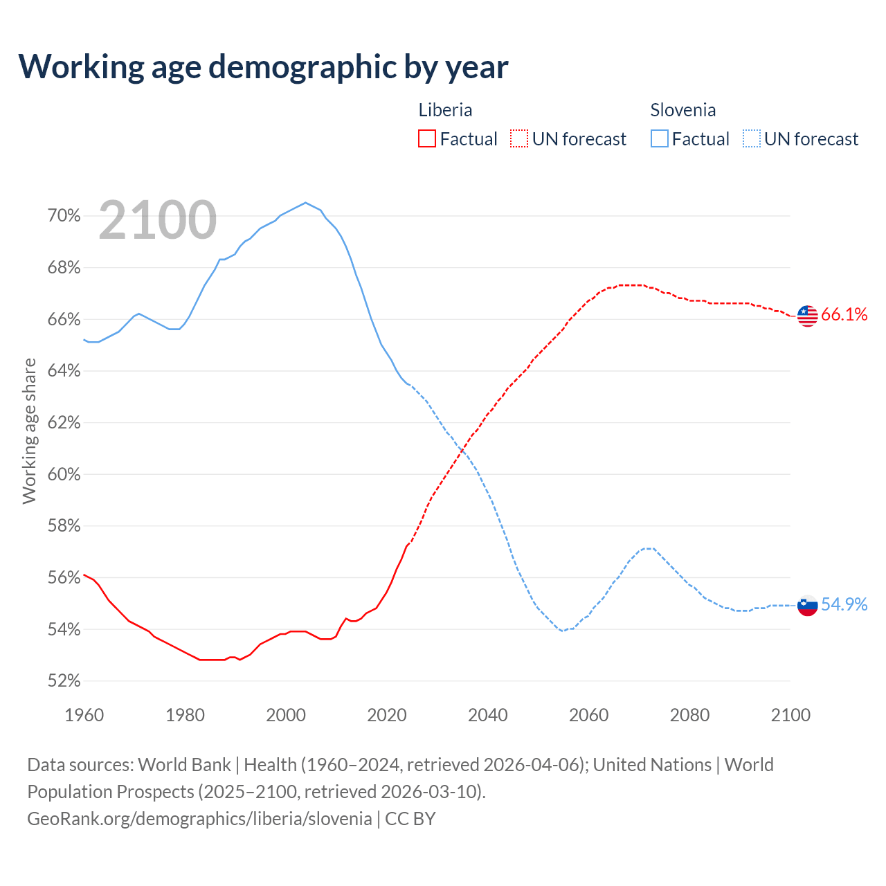 - Liberia has 3.37M working age adults (aged 15-64) vs 1.35M in Slovenia.