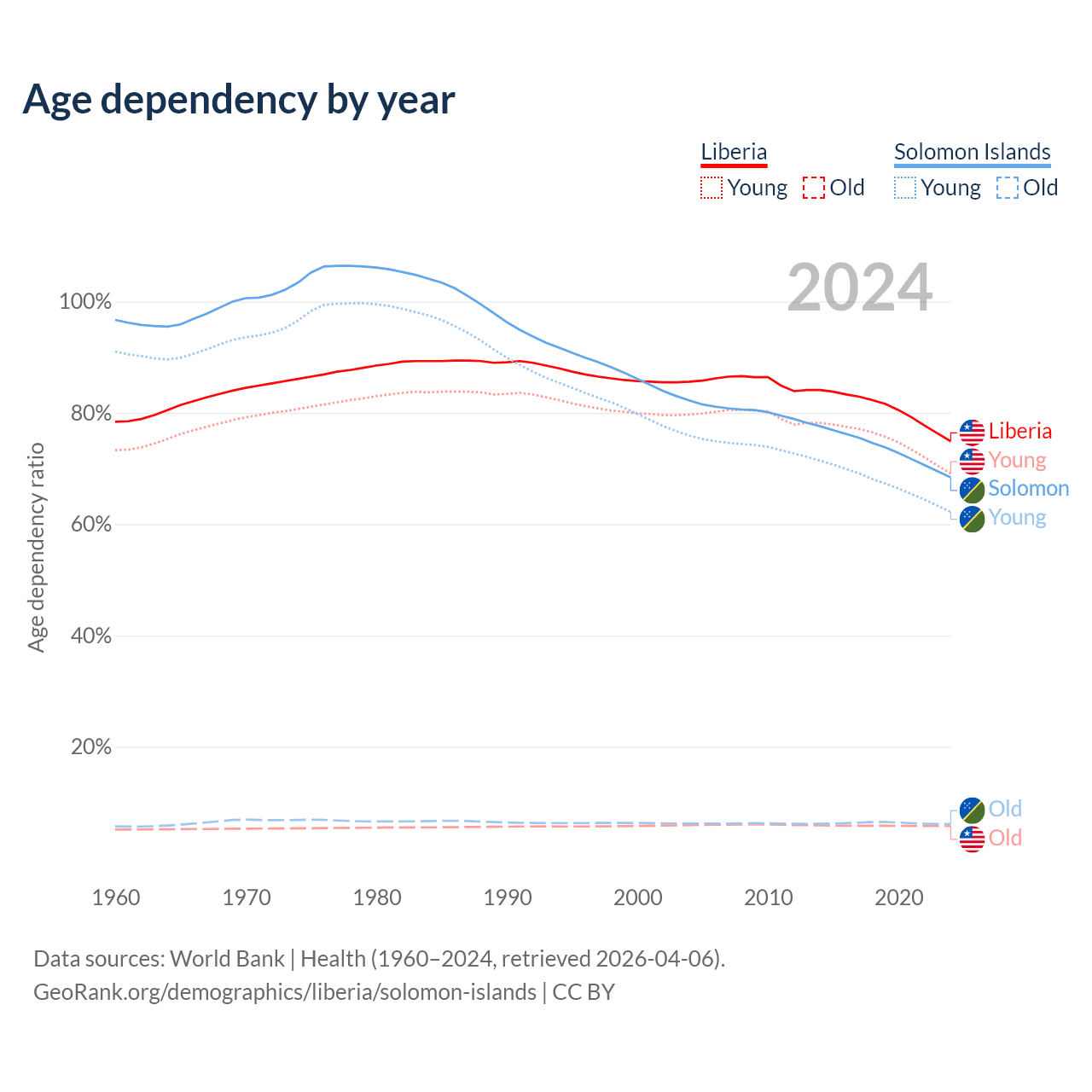 - Liberia is ranked 169/196 by median age (oldest to youngest) vs 153/196 for the Solomon Islands.