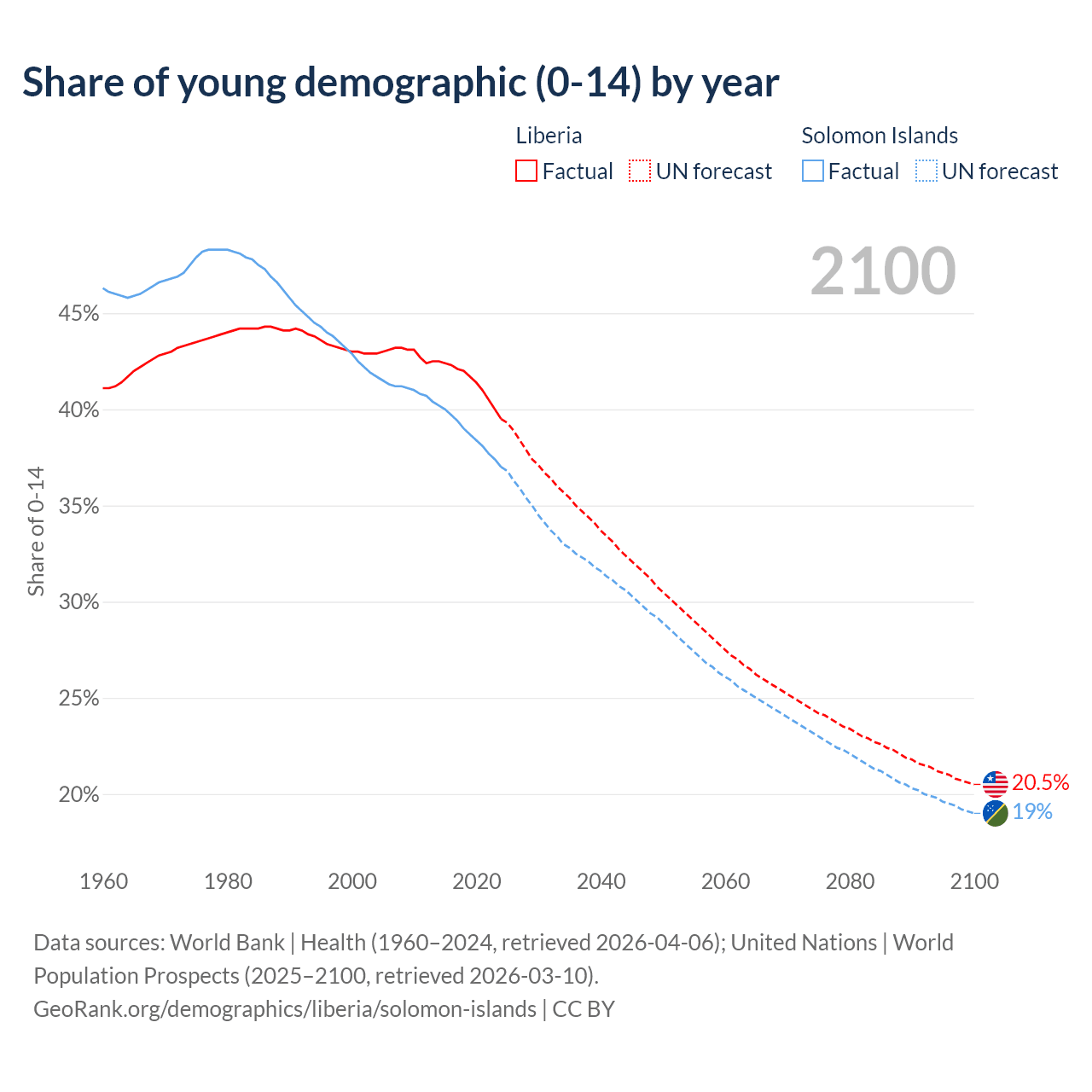 - The share of young demographic (0-15 years old) in Liberia is 39.5% vs 37% in the Solomon Islands.