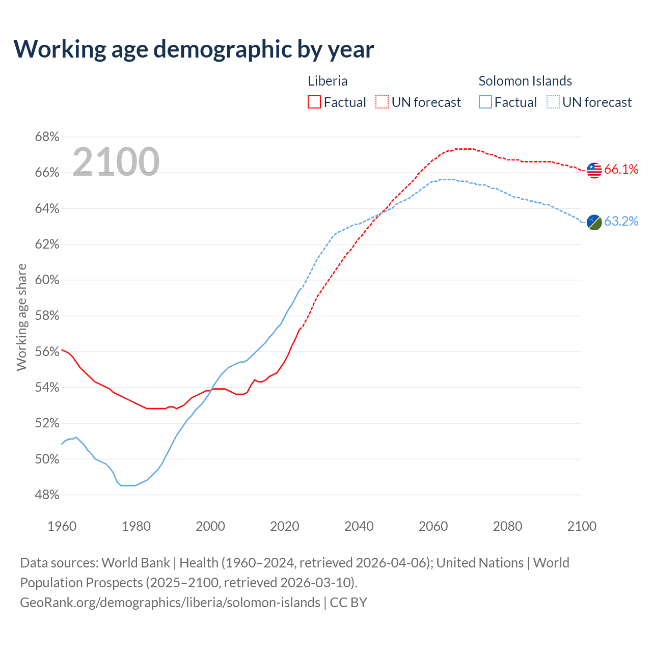- Liberia has 3.37M working age adults (aged 15-64) vs 513K in the Solomon Islands.
