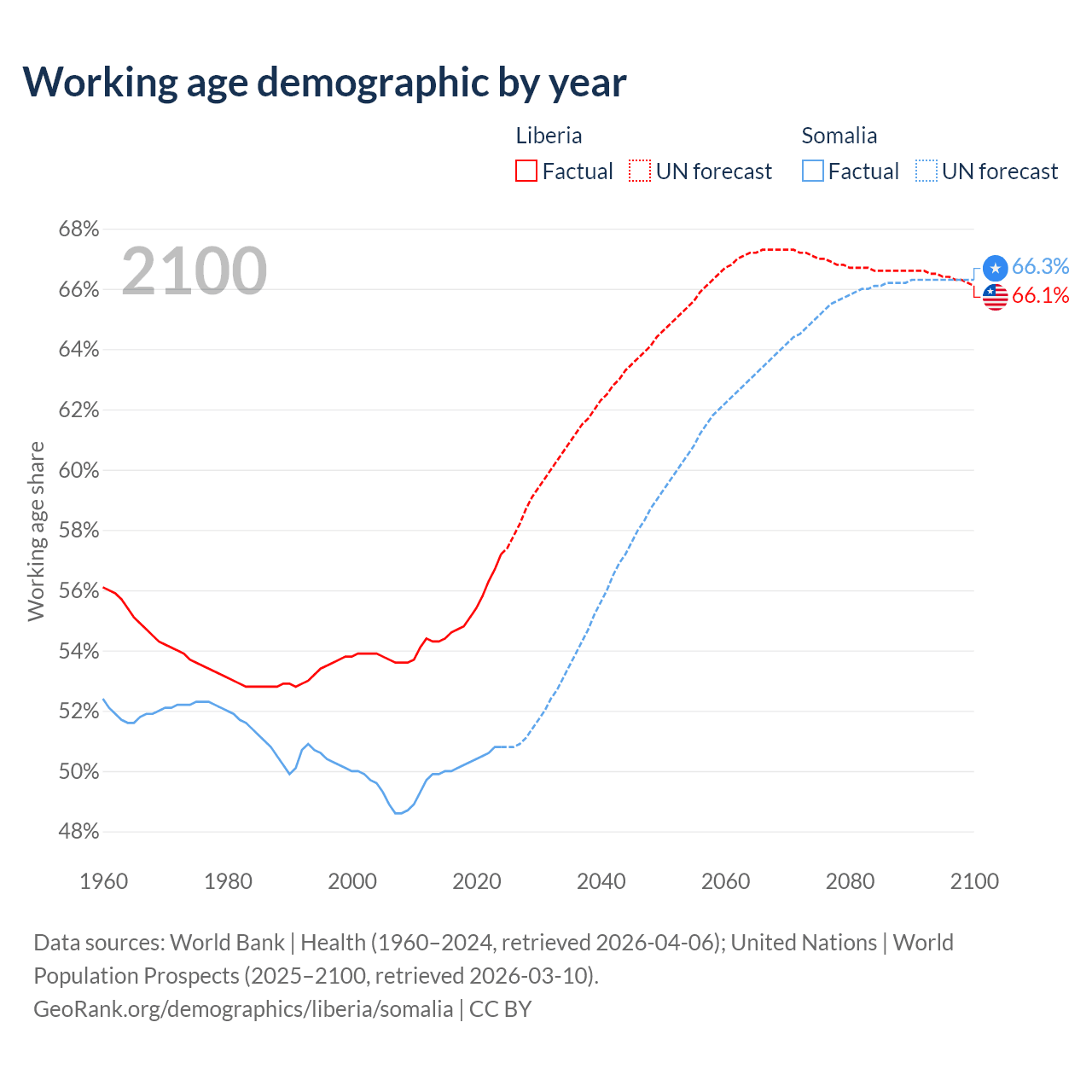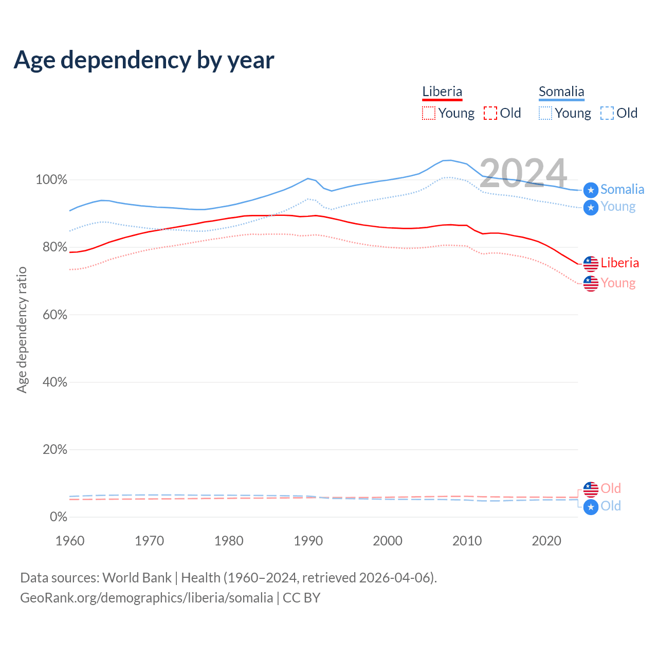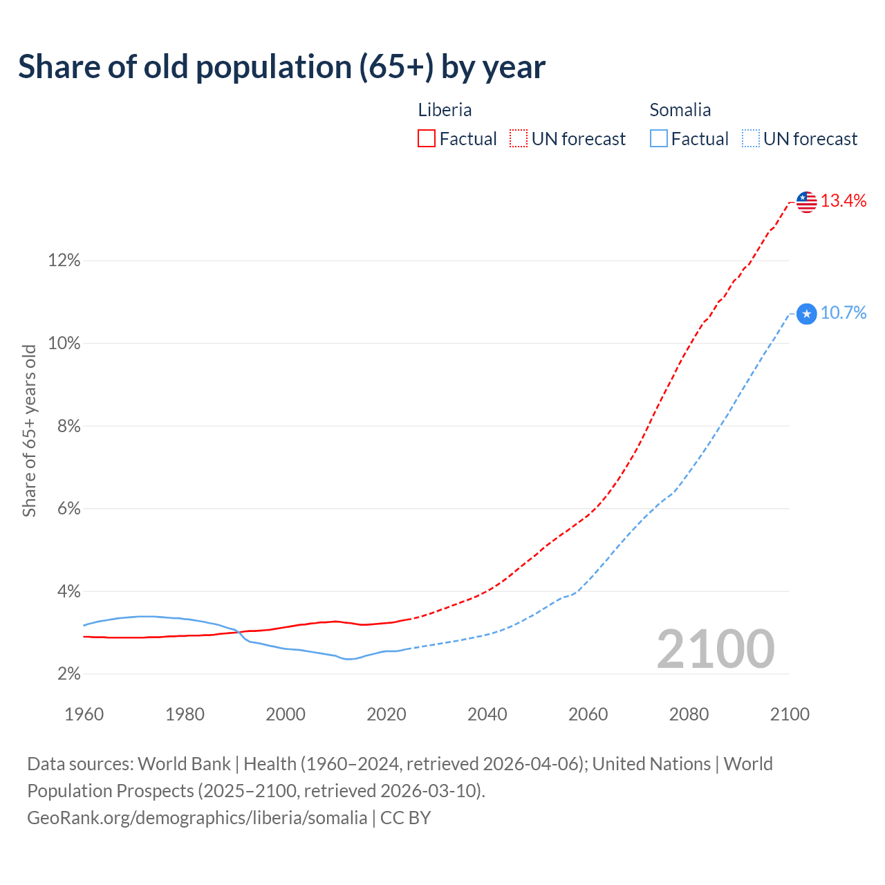- The share of old-age demographic (65+) in Liberia is 3.3% vs 2.59% in Somalia.
