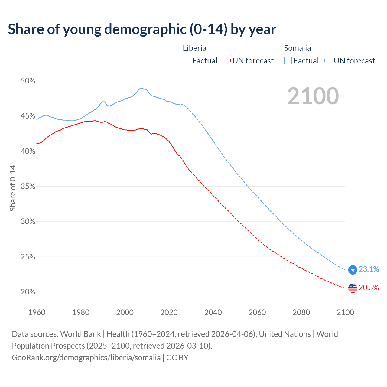 - The share of young demographic (0-15 years old) in Liberia is 39.5% vs 46.6% in Somalia.